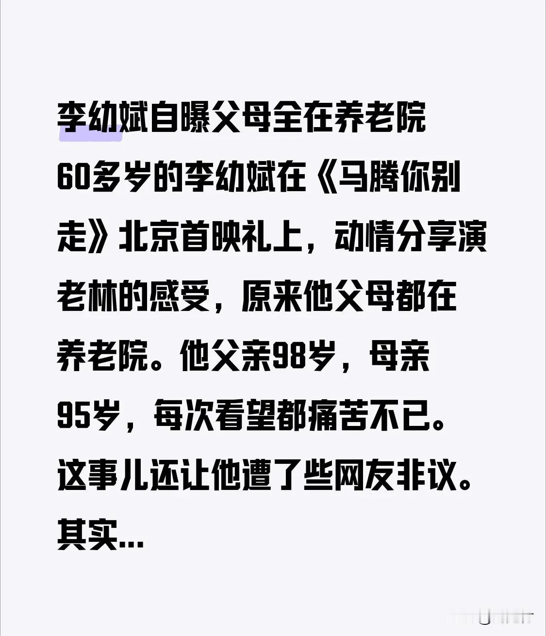 李幼斌自曝父母全在养老院 李幼斌自曝父母均在养老院。60多岁的李幼斌在《马腾你别走》北京首映礼上,动情分享饰演老林的感受,原来他的父母都在养老院。他父亲98岁,母亲95岁,每次去看望父母,他都痛苦不已。此事还让他遭到一些网友非议。 其实李幼斌也不容易,他年近70,还患有老年病,拍戏繁忙,生活不规律。影片中老林面临给父母养老的难题,与他的现实遭遇相似。他将这份感同身受融入角色,表演定会更加动人。这也让我们看到明星背后的无奈,希望大家多些理解,少些指责。 李幼斌 明星养老院