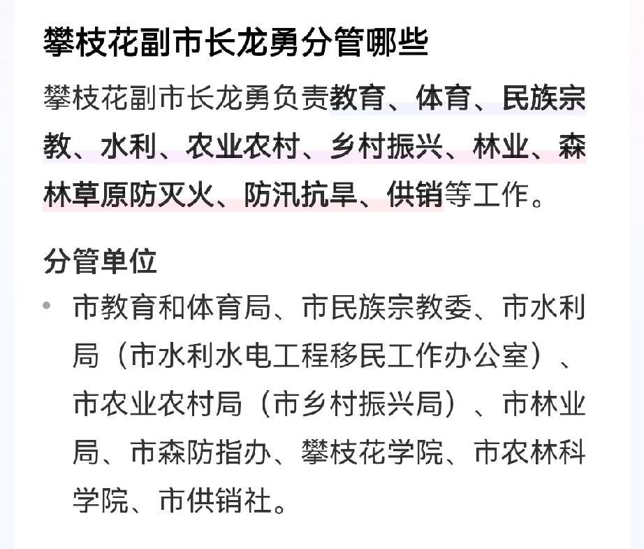 攀枝花教育系统多人被请后,政府分管副职龙勇今官宣 1973年12月出生的龙勇,2007年5月从市团w步入市w办。 5年后,经市文旅部门一年过渡,到任西区。在该区一待就是8年多。 2022年1月,提任市府副职。分管教育体育、农林水利等工作。 而去年,攀枝花市教育系统有多人先后被查。 最近的是该市教体局ju长李福惠,去年8月28日官宣。 按照分工,李算是龙勇的直接下属。 从公开信息看,攀枝花市这些年来真没有龙勇这一级别的人物官宣。 龙勇的被请,是否能在攀枝花撕开口子? 值得期待。