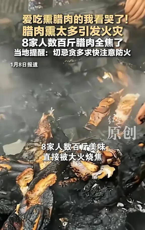 悲剧还是发生了!四川南充,8户人家在熏腊肉时,为了快一点,就把数百斤腊肉都放进了熏腊肉的设备里面,结果因为太多腊肉滴油,导致设备突然起火,腊肉全被烧焦,一眼望去全是残骸,让人非常心疼。网友:爱吃腊肉的我哭了! 赶到现场的消防员说,火灭了之后,熏制设备里的腊肉早就成了黑黢黢的炭块,有的还在冒着余烟。有位大妈蹲在旁边,手里攥着原本准备挂腊肉的绳子,看着那堆焦黑的残骸直抹眼泪,说这些肉是攒了大半个月的年货,想着一次熏好省事儿,没想到全毁了。旁边还有几户人家的代表,脸色都铁青,你一言我一语说着“早知道分批次熏就好了”“当时觉得挤一挤没事”。 其实这种事真的不是第一次发生,每年一到腊月,四川、重庆这些爱吃腊味的地方,消防通报里总能看到熏腊肉引发火灾的新闻。不是没人提醒,消防部门每年都会发安全贴士,说熏制时别贪多、要留人看守、油脂要及时清理,可总有人觉得“哪有那么巧”,抱着侥幸心理图省事。就像这次南充的事,8户人家为了“快一点”,把设备塞得满满当当,油脂滴落的速度远超设备的承受能力,火苗一沾就烧了起来,几百斤腊味瞬间成了泡影,这哪里是省事儿,分明是给自己找了大麻烦。 四川人对腊味的执念刻在骨子里,冬腊月的街头巷尾,挂着的腊肉香肠就是年味的象征。我外婆以前在老家熏腊肉,每次都只挂十几斤,守在旁边时不时翻一翻,还会在设备下放个铁盆接油脂,她说“慢工出细活,熏腊味本来就是磨时间的事,急不得”。去年隔壁村有户人家,也是想一次熏完几十斤肉,结果没人看顾引发小火,虽然及时扑灭没酿成大祸,但半扇猪肉还是废了,现在提起来还直拍大腿。 说到底,这次的火灾根本不是“意外”,而是贪多求快的心态埋下的隐患。腊味再香,也抵不过安全重要;年味再浓,也不能拿生命和财产赌侥幸。那些被烧焦的腊肉,不仅是几百斤食材的损失,更是给所有准备熏腊味的人敲了个警钟:传统的年味要守,但安全的底线更不能破。 你身边有没有见过熏腊味时因为贪快贪多出问题的事?你家熏腊味又有哪些自己总结的安全小技巧?评论区聊聊,别让这份年味变成遗憾!
