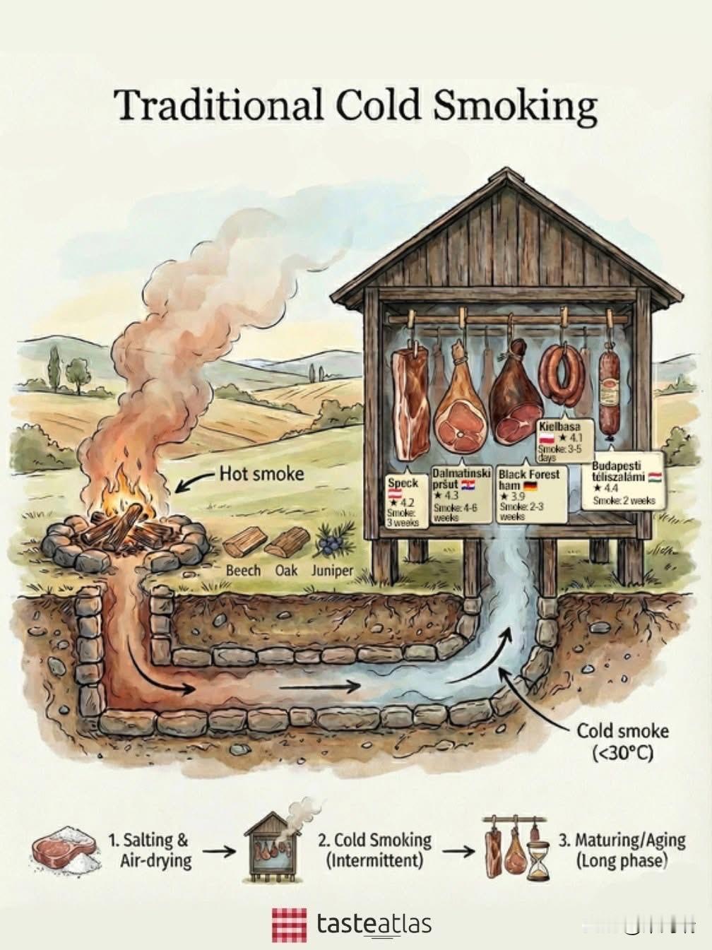 传统冷熏是一种在低温(低于 30°C)下对肉制品进行烟熏以达到风味和防腐目的的加工工艺。它主要用于制作不进行后续加热工序的熟成肉制品,例如培根、干燥香肠和火腿。 传统冷熏方法和原理 传统冷熏的关键在于将热源(燃烧的木材)与烟熏室分离,通过长烟道冷却烟气,确保肉制品在低温下被烟熏。 原理:烟气中的酚类、醛类等成分渗入肉的内部,形成茶褐色有光泽的薄膜,提供特殊的烟熏风味,并具有抗氧化和一定的抑菌作用,从而延长产品的保质期。由于温度低,脂肪不易融化,制品能保持较好的质地。 主要步骤: 腌制与风干 (Salting & Air-drying):原料肉(通常是猪肉)先用盐腌制,然后进行初步风干,去除部分水分。 冷熏 (Cold Smoking):将腌制好的肉挂入烟熏室。在单独的火源处燃烧木材(如山毛榉、橡木、杜松等),产生的热烟通过地下或地面的长管道冷却后进入烟熏室。烟熏温度通常保持在 15-25°C 之间,时间较长,短则数天,长则数周。 熟成/陈化 (Maturing/Aging):烟熏后的肉制品会经历一个长时间的熟成过程,使烟熏成分均匀渗透,风味更佳,质地变软。 典型冷熏产品 附图展示了使用传统冷熏方法制作的几种欧洲特色肉制品的烟熏时间。 培根 约 3 周 达尔马提亚火腿 约 4-6 周 黑森林火腿 约 2-3 周 香肠 约 3-5 天 布达佩斯冬季萨拉米香肠 约 2 周 黑森林火腿是德国黑森林地区的标志性产品,制作过程需要相当长的时间,是最高贵的冷熏火腿之一。这些冷熏制品通常含水量低,耐储存性好。