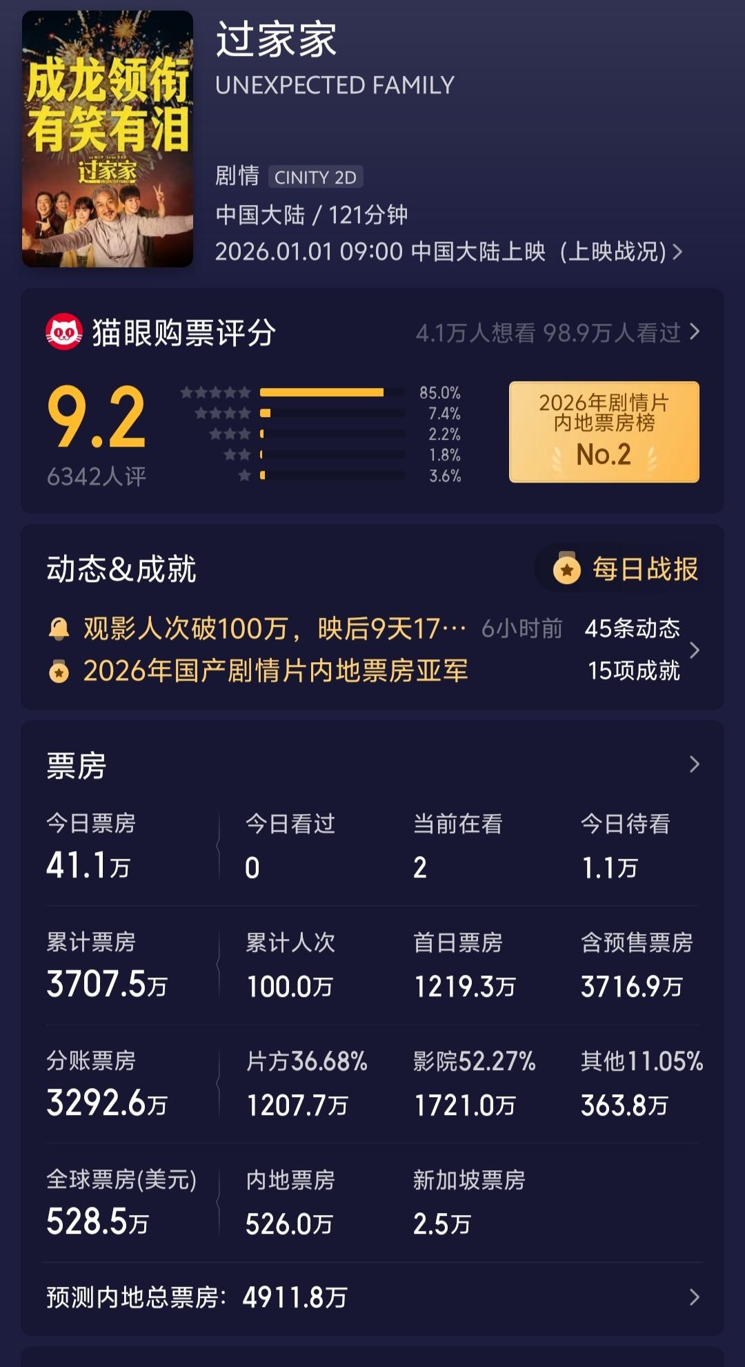 《寻秦记》把成龙新片打得措手不及 元旦档上映的两部由香港演员主演的电影,票房差距为何如此之大? 《寻秦记》由古天乐主演,《过家家》则是成龙主演。 《寻秦记》上映11天,内地票房达2.28亿人民币,香港票房为677万美金,全球票房4171万美金,接近3亿人民币。 反观成龙的《过家家》,上映10天,内地票房仅3707万人民币,全球票房才528万美金,折合3800万人民币。 古天乐这次可把成龙打得有点懵。 话说成龙电影票房落差咋这么大呢?记得《捕风捉影》票房超12亿,到《过家家》却只有3000万。 寻秦记 寻秦记剧组