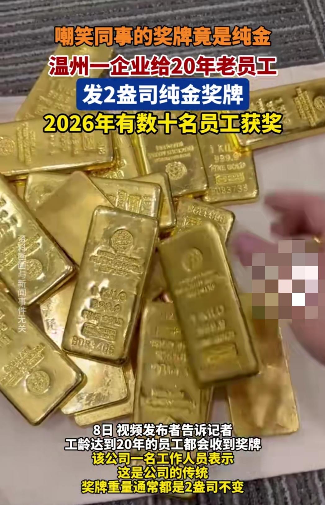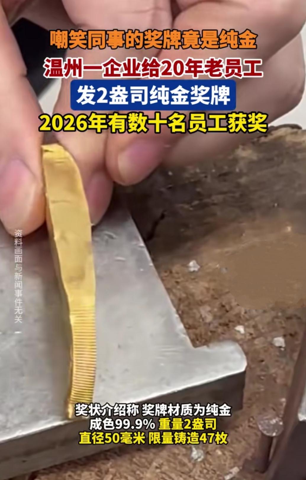浙江温州这事儿直接把人看懵了!有员工瞧见同事带块“平平无奇的纪念奖牌”没当回事,随口调侃了两句,结果一问直接傻眼——这是公司给20年老员工发的纯金奖牌,成色99.9%、重2盎司,今年光获奖的就有数十人,还是限量铸造的。 网友刷到后直接慕疯了:有人说“这哪是奖牌,分明是行走的黄金啊”,也有人感慨“20年扎根一个岗位,换这么块真金,比啥空头荣誉都实在”。还有人扒出这是企业传统,每年都给满工龄员工发同款纯金奖牌。 这奖牌看着低调,实则是真金砸出来的认可。20年从青涩新人熬成资深老员工,这份坚守换得沉甸甸的回馈,你觉得这福利算不算职场“天花板”级别的?
