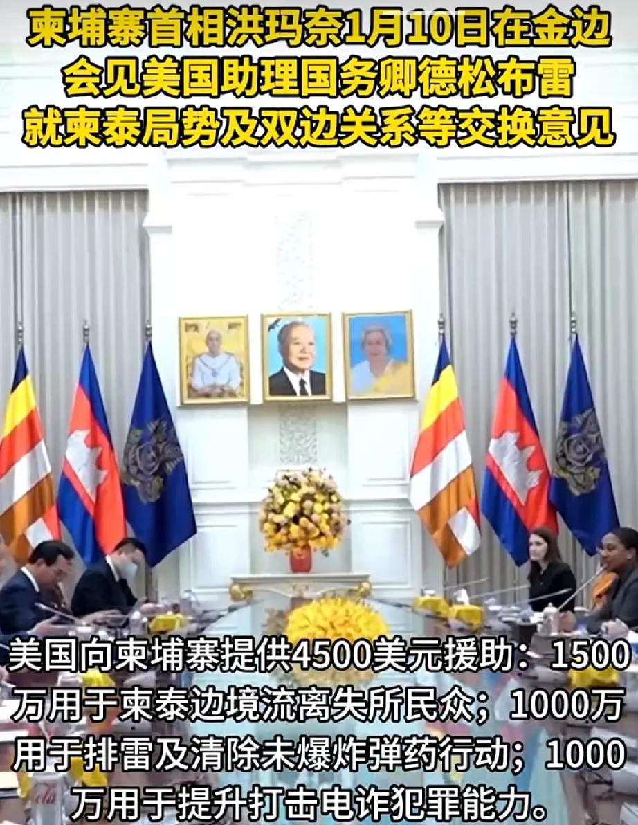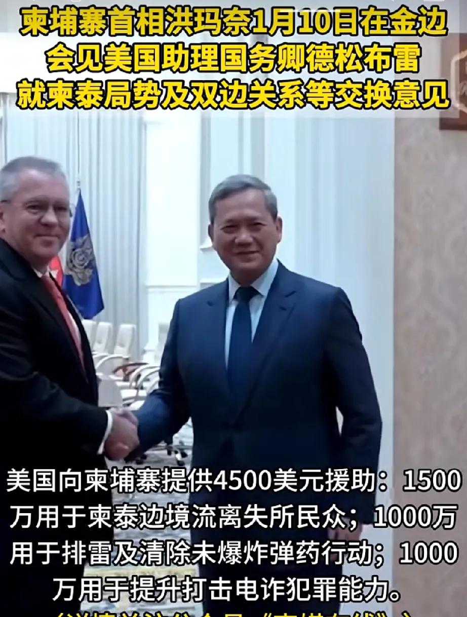 柬埔寨现在又和美国好的一塌糊涂…… 1月10日,美国亚太专员专门跑到柬埔寨金边送上4500万美元大红包: 而且把大红包说的很详细1500万用于救济柬埔寨人,1000万用于排雷,1000万用于打击电诈。 可以说对柬埔寨照顾的是非常体贴入微。
