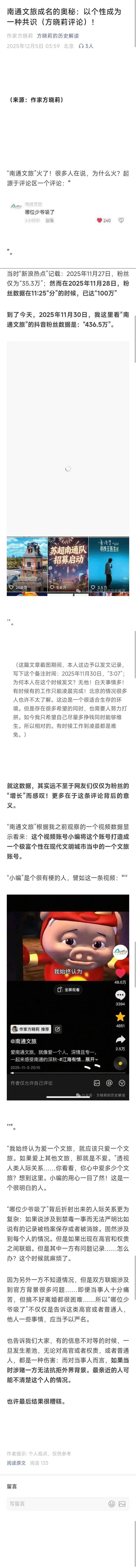 我一贯尊重他人,哪怕是伤害我的人……但是你一再恶心本人,包括诬陷本人,举报本人关于“南通文旅”一事方面的作品。证明你杨晓杰之前的举报行为,包括举报本人支持公方彬教授辟谣以及本人其他社会辟谣作品当中,你所透露出来的人格。有十分的问题。