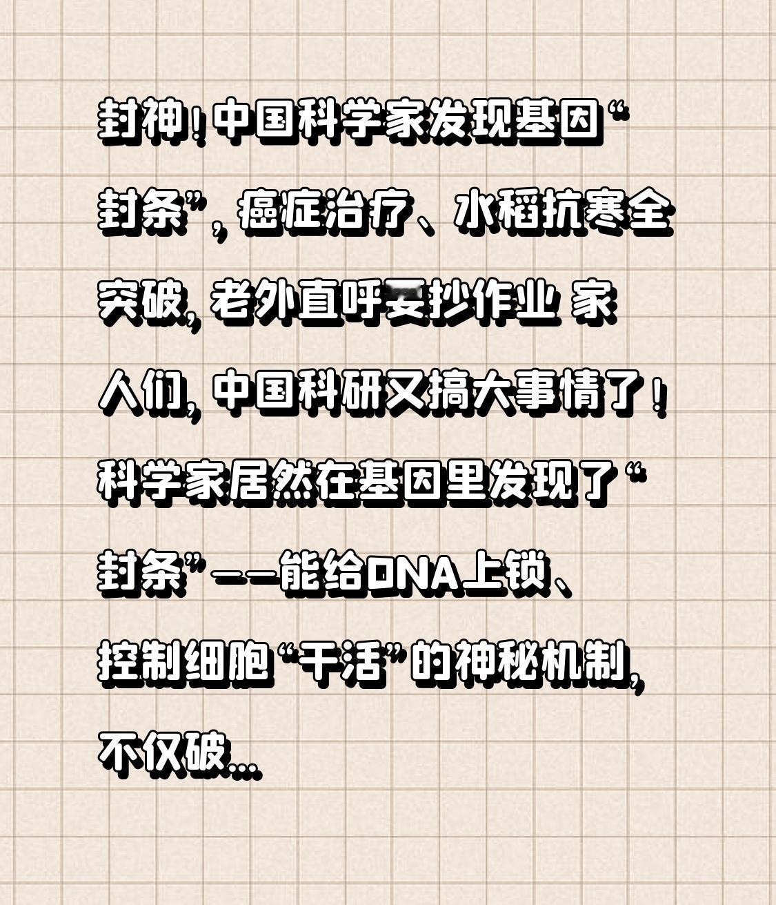 封神!中国科学家发现基因“封条”,癌症治疗、水稻抗寒全突破,老外直呼要抄作业