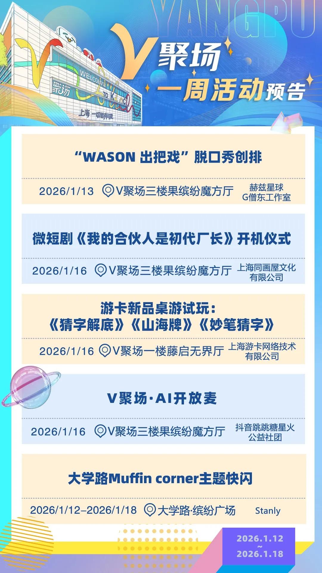 与千万粉丝“UP主”面对面互动,和B站、抖音、小红书等互联网大厂座谈交流,与AI领域创始人探讨人工智能发展新趋势……在杨浦V聚场,随时都有最前沿活动等你来打卡。无论你是互联网从业者,还是创意玩家……这里都将成为你迸发灵感的“能量场”。V聚场1月12日-1月18日一周活动预告来啦!快来碰撞灵感!