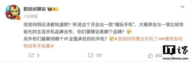 IT之家1月12日消息,今天午间,博主@数码闲聊站爆料称,“听说”泡泡玛特本月将推出一款“潮玩手机”,大概率会与一家比较年轻化的主流手机品牌合作。不过,该博主并未披露具体厂商,而是将悬念留给了评论区。