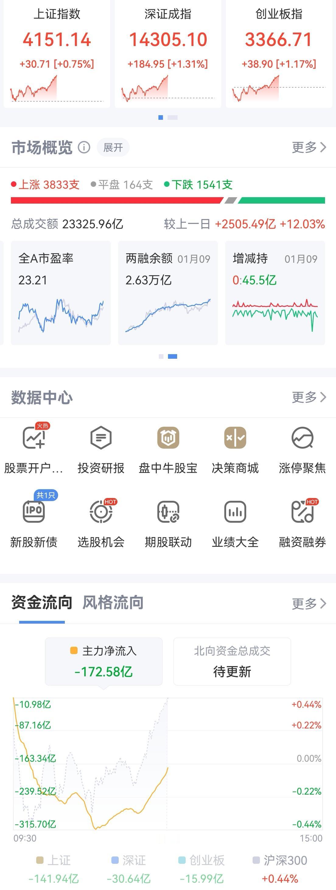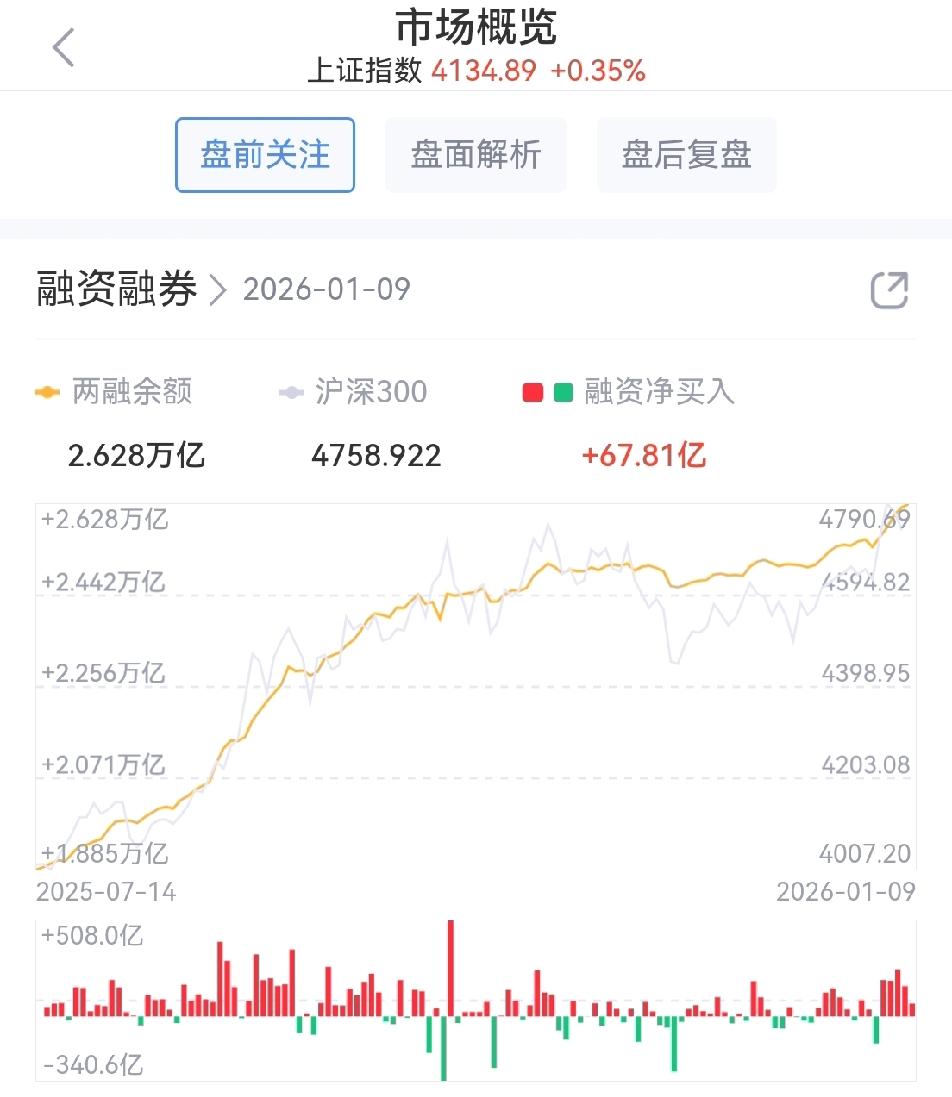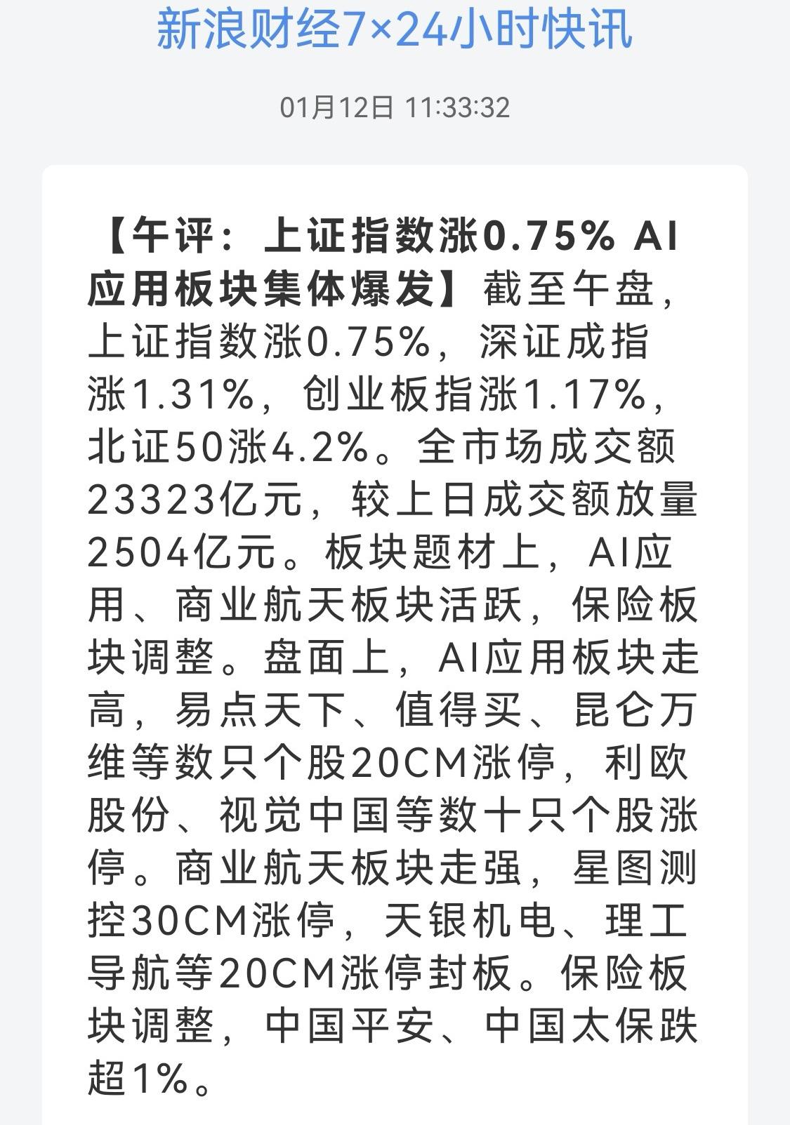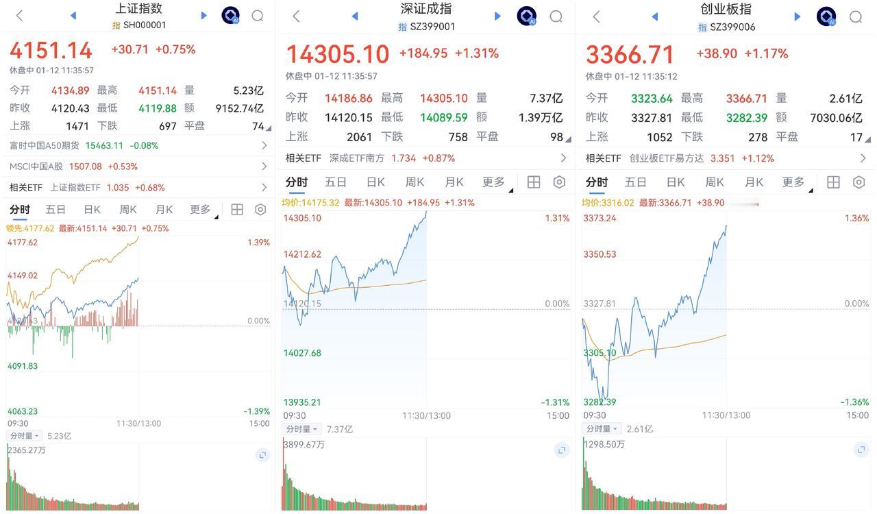 午盘印象(1月12日) 买入拥挤 调整无力 外围:美股上涨 英伟达续跌 隐忧继续 内股:航天军工领跑暴走 热度点燃全场 一、三大股指开盘红绿,创业板承压: 指数稍强,震荡清洗获利盘 个股开盘涨平跌比率58%:14%:27%。 个股开盘强势(+31 Vs -8个百分点),远胜上个交易日 二、指数震荡上扬,调整不下去: CPO和电池低开,创业板弱势,又被航天带动探底回升 2.3万亿交易量,指数新高不断 三、涨跌幅榜: 航天引领科技,红利调整,非银分化 跌幅前列:大金融、电池、元件 涨幅前列:AI应用、航天军工、信安 四、开盘和午盘: 开盘:沪+0.35%、深+0.47%、创-0.13%。 午盘:沪+0.75%、深+0.31%、创+1.17%。 开盘创业板稍承压,指数攀升中 五、午盘个股上涨69%,接近七成,与昨日涨跌差距(+41 Vs -11个百分点);与开盘相比,涨跌差距扩大,上涨更多。 净流出-173亿,相比昨日,出逃稍减缓 六、沪深两市成交量午盘23,069亿,上个交易日20,614亿,同比量能扩张接近2,500亿,放量上涨。 七、指数连创多年新高,量能已狂热 震荡上扬,半日2.3万亿,买入汹涌 连续5天融资额大幅净增加,两融余额已至2.63万亿,谨慎谨慎 午后两种情形: 1、平行震荡:时间换空间,缓步消化获利盘,红包行情继续。 2、震荡回调:量能暴涨,谨防跳水,时空加速统一,慢牛格局不变。 (图片源自网络侵权告知删除)