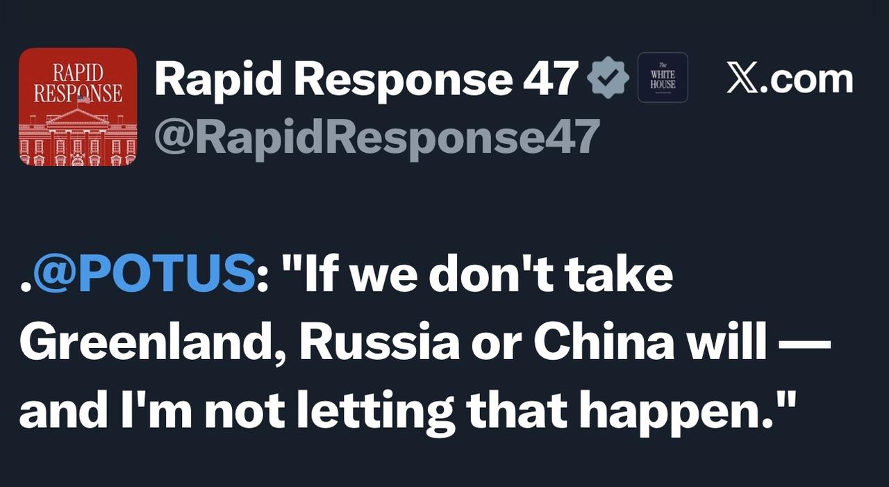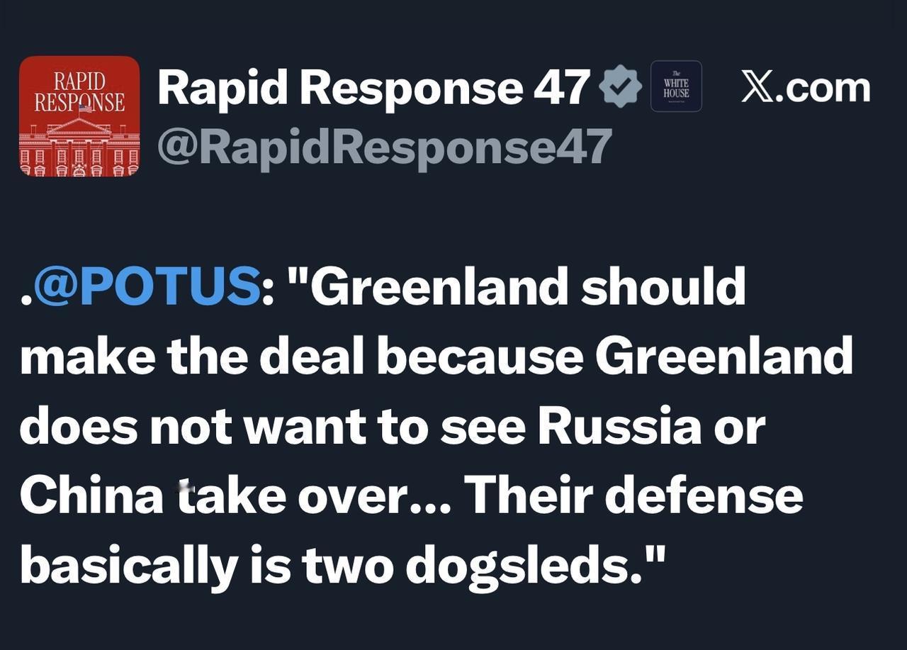 简直胡说八道,张口就来 特朗普:“格陵兰应该达成协议,因为格陵兰不想看到俄罗斯或中国接管……他们的防御基本上只有两辆狗拉雪橇。” “如果我们不拿下格陵兰岛,俄罗斯或中国就会拿下——我绝不会允许这种情况发生。”