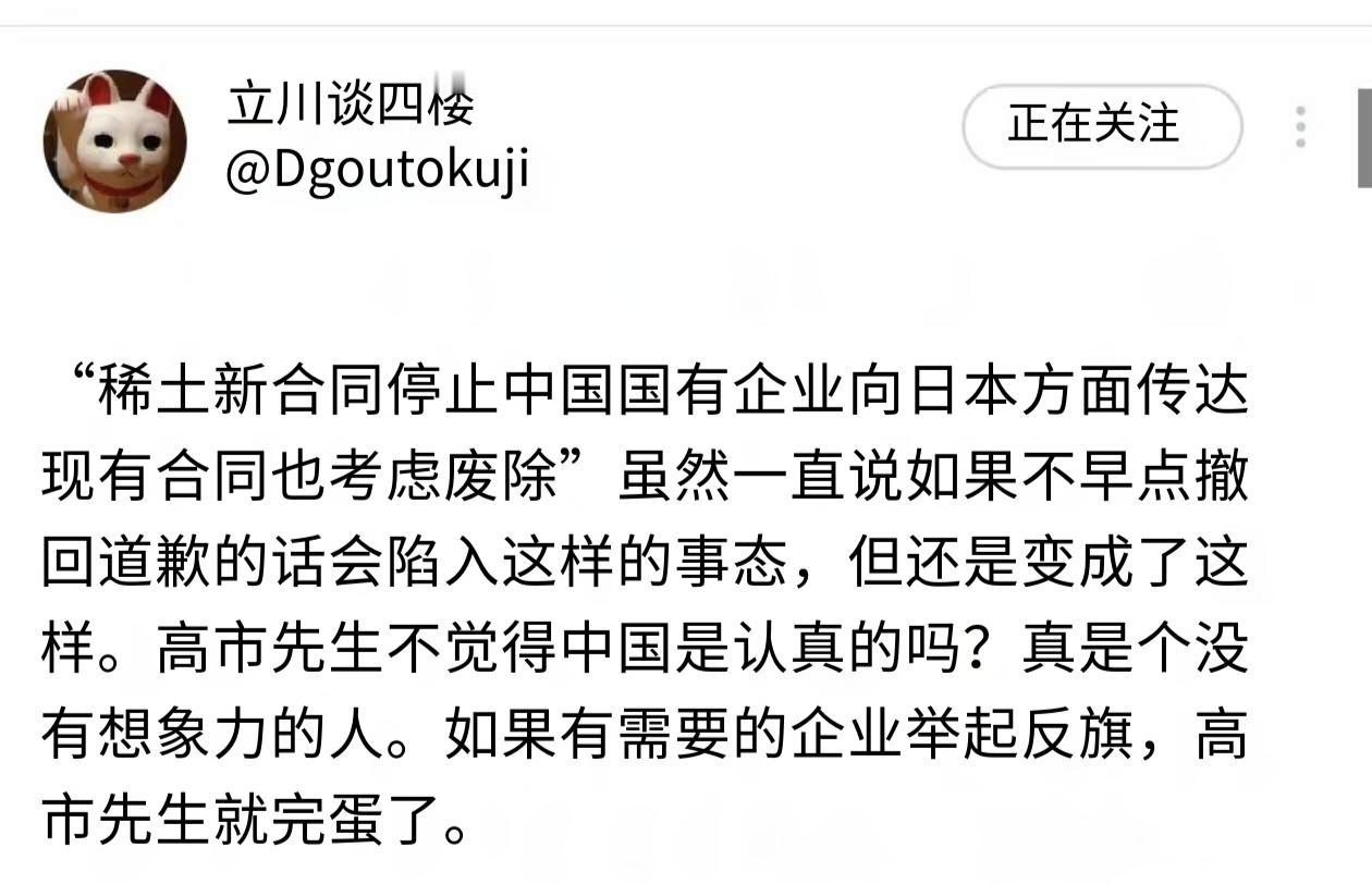 1月12日,日本作家立川谈四楼发文称:“稀土新合同停止,中国国有企业向日本方面传达现有合同也考虑废除。虽然一直说如果不早点撤回道歉的话,会陷入这样的事态,但还是变成了这样。高市首相不觉得中国是认真的吗?真是个没有想象力的人。如果有需要的企业起来反抗,高市首相就完蛋了。” 这位作家说的话中肯,精准批判了高市早苗错误言论为日本带来的严重后果,虽然早已经料到会有这样的后果产生,但也没想到会这么快,这么稳的卡住了日本稀土方面的需求。 高市早苗虽然对我国的精准反制发表了意见,但又能怎样呢?依然改变不了日本遭受损失的事实。谁让你说了不该说的话,做了不该做的事,至今未有悔过之意,却还依旧游走在危险的边缘。 日本的稀土需求高度依赖中国,如今造成今天的困境,即使日本通过其他途径寻求稀土供应突破,但短时间内也不是一件容易的事情。 日本的一些企业或正在为稀土断供而焦躁不安,这种不安的心里也会进一步蔓延加剧,这一切都是高市早苗造成的。 相关的企业若要讨说法,那就直接找高市去吧,只有高市早苗认识到了错误,才能把中日关系挽回到正确的轨道。