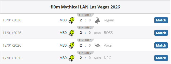 本次M80以头号热门身份来到拉斯维加斯,并以压倒性表现兑现了期待:他们赢下所有比赛地图,仅让对手两次在单张地图上取得回合数上双。