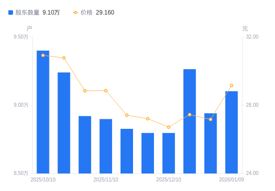 日期A股户数(户)流通A股户均持股数(股)户均持股市值(万元)2026-01-09910348429.8524.582025-12-31894168582.3923.322025-12-19926458283.2722.742025-12-10879708723.4623.312025-11-28879708723.4623.742025-11-20882698693.9223.842025-11-10889868623.8624.892025-10-31892148601.8224.822025-10-20924087857.0124.182025-10-10940037723.7023.89