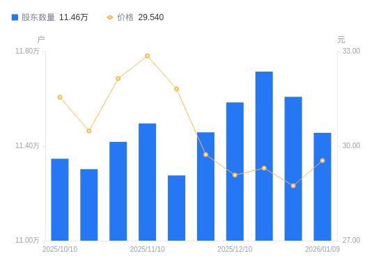 日期A股户数(户)流通A股户均持股数(股)户均持股市值(万元)2026-01-091145564736.9613.992025-12-311160784674.8513.442025-12-191171454632.2713.572025-12-101158474684.1713.622025-11-281145794736.0114.082025-11-201127544812.6615.312025-11-101149574720.4415.512025-10-311141774752.6815.282025-10-201130214801.2914.632025-10-101134614782.6815.09