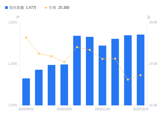 日期A股户数(户)流通A股户均持股数(股)户均持股市值(万元)2025-12-191473413321.8133.812025-12-101471013343.5533.002025-11-281457113470.8437.402025-11-201430913717.4938.022025-11-101464613401.8638.922025-10-311468913362.6239.352025-10-201357814456.0039.452025-10-101356214473.0640.672025-09-301337614674.3141.852025-09-201304115051.2746.40