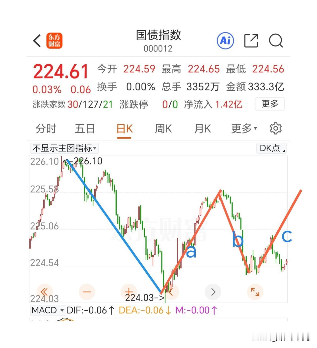 调整很快会到来!请大家关注一下国债指数和人民币汇率走势。 股票市场走的如火如荼,每天都在创新高,不代表着调整没有,事实上牛市多急跌,要么不跌要么大跌。 在股市调整的时候,往往伴随着人民币汇率的贬值和国债指数的走高。股债汇并不是同步的,都需要大量资金去推动的,往往股市和另两个走相反的走势。 先说人民币汇率,从图一可以看到macd底背离信号出现,汇率在走低,macd在走高,对于修复日线底背离,要么大跌,要么反弹。汇率反弹的时候,股市会进入调整阶段。 再看国债指数,从浪形上这个反弹浪缺少一个B段里的小c段上涨,如果创新低那么资金会继续推动股市新高,如果它走c段上涨会和股市分流资金,股市可能会调整。 在股市一片红火的时候,你要想好当调整来临的时候你撤不撤退,还是怕踏空直接拿住不动等待第二波?凡事预则立,不预则废。做好计划,心中不慌。 汇率走向分析 国债分析 人民币指数 国债市场 离岸人民币指数