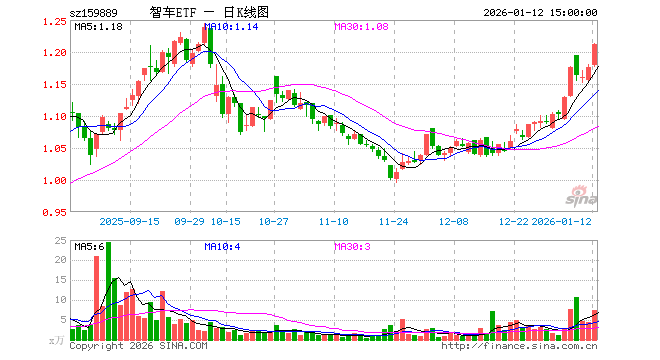 1月12日,智能汽车ETF(159889)涨2.98%,成交额898.39万元。当日份额减少100.00万份,最新份额为4140.08万份,近20个交易日份额增加200.00万份。最新资产净值计算值为5016.12万元。