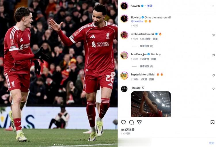 两人也都在赛后通过社媒晒出同框照并互相艾特了对方,维尔茨还配文“晋级下一轮”。