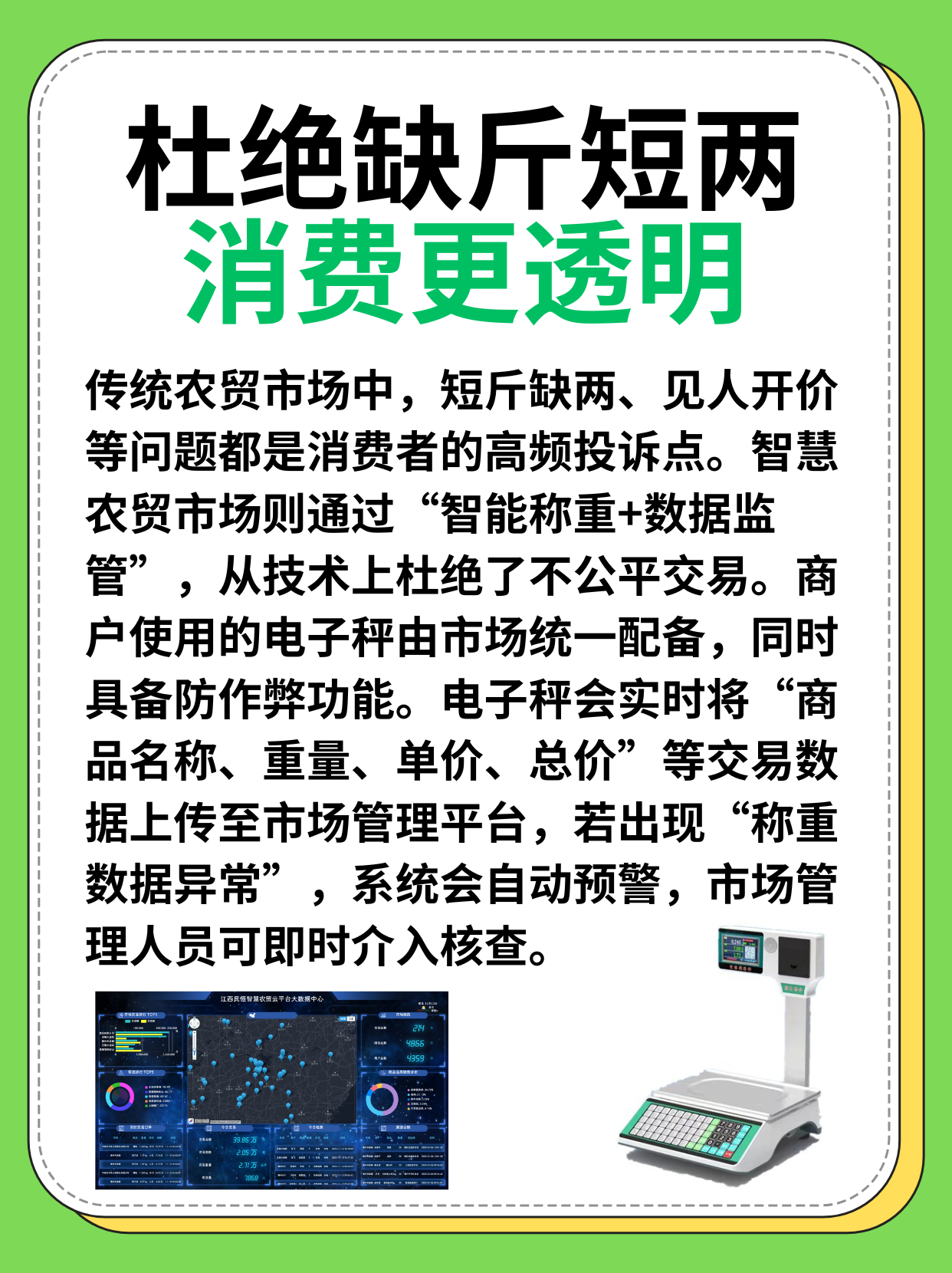 一、解决食品安全,菜品可溯源 二、杜绝缺斤短两,消费更透明 三、告别“脏乱差”,买菜更舒心 四、保障售后追溯,维权更省心