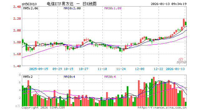 1月13日,电信ETF易方达(563010)开盘跌2.15%,报2.138元。电信ETF易方达(563010)重仓股方面,新易盛开盘跌1.56%,中际旭创跌1.89%,中国联通跌0.18%,中国移动涨0.01%,中国电信涨0.16%,银之杰跌0.02%,中国卫通跌0.02%,中兴通讯涨0.00%,天孚通信跌1.00%,紫光股份涨0.74%。