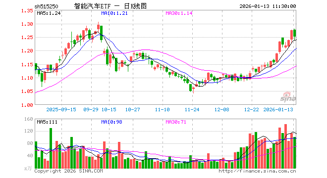 1月13日,截止午间收盘,智能汽车ETF(515250)跌1.96%,报1.250元,成交额1.26亿元。智能汽车ETF(515250)重仓股方面,立讯精密截止午盘跌0.63%,芯原股份涨0.01%,拓普集团涨1.08%,豪威集团跌2.73%,科大讯飞涨4.43%,德赛西威跌3.13%,闻泰科技跌2.25%,欧菲光跌2.45%,均胜电子跌0.98%,思特威跌0.88%。