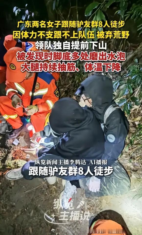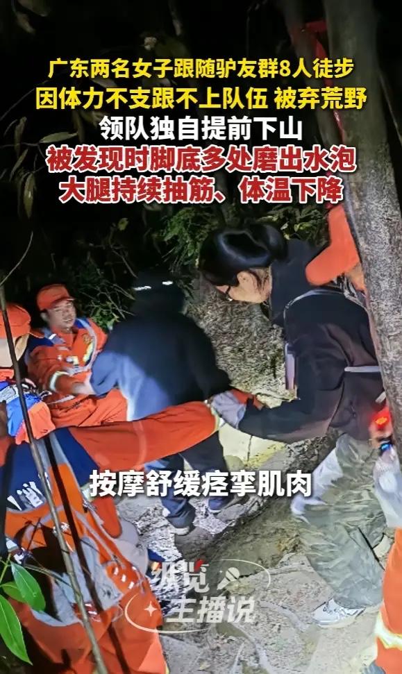 “必须严惩!”1月11日,广东惠州,两名女子跟随登山团一起徒步,不料途中体力不支,慢慢跟不上队伍,结果带队的人嫌她们走太慢,竟将两人遗弃留在荒野中,自己则带着其他队员离开,等到凌晨时两人才被救下山。网友:太无情了! 那天惠州罗浮山的天气有些阴沉,这支临时凑成的8人徒步队一早就从野路出发,打算反穿画鱼线前往飞云顶。路线选得有些挑战性,山路崎岖,对平时不太爬山的人来说确实吃力。 两位渐渐掉队的女士越走越慢,领队不时回头催她们快些,其中一位女士实在撑不住,扶着膝盖请求休息几分钟,但领队担心耽误全队进度,没有同意。 令人难以接受的是,领队最终决定带着其他6名队员继续前进,把两位体力不支的女士单独留在了信号时有时无的深山里。 山里的夜晚来得特别快,温度降得厉害。两位女士又冷又怕,靠着手电筒微光搀扶着慢慢移动。其中一位因为没穿专业登山鞋,脚底磨出了水泡;另一位体力透支,连呼救的力气都快没了。 幸好她们用手机勉强发出的求救信号被惠州市朱明洞消防救援站收到了。五名消防员带着急救包和保暖物资立刻进山。夜里山路难辨,救援人员花了一个多小时才找到她们。看到两人有失温迹象,队员马上为脚起泡的女士消毒包扎,并给两人补充了能量食品。 下山路更难走,救援队员轮流搀扶、鼓励,直到凌晨一点半才安全抵达山下。这时两位女士已被困近五个小时。 在不久前,罗浮山景区就发过通告,明令禁止夜间登山,并强调组织者必须对参与者安全负责。但许多自发组成的“驴友群”并没有遵守这些规定。 户外徒步,安全必须放在第一位。组织活动的人要提前勘察路线、评估风险,并确保队伍中有专人照顾走得慢的队员,绝不能半路抛弃同伴。参与的人也要量力而行,新手不要轻易挑战未开发的野线,出发前备好登山鞋、饮水、照明等基本装备。 两位被救的女士当时害怕得浑身发抖,以为要在荒山里过夜了。这次遭遇给她们留下了很深的心理阴影。 各位读者你们怎么看?欢迎在评论区讨论。
