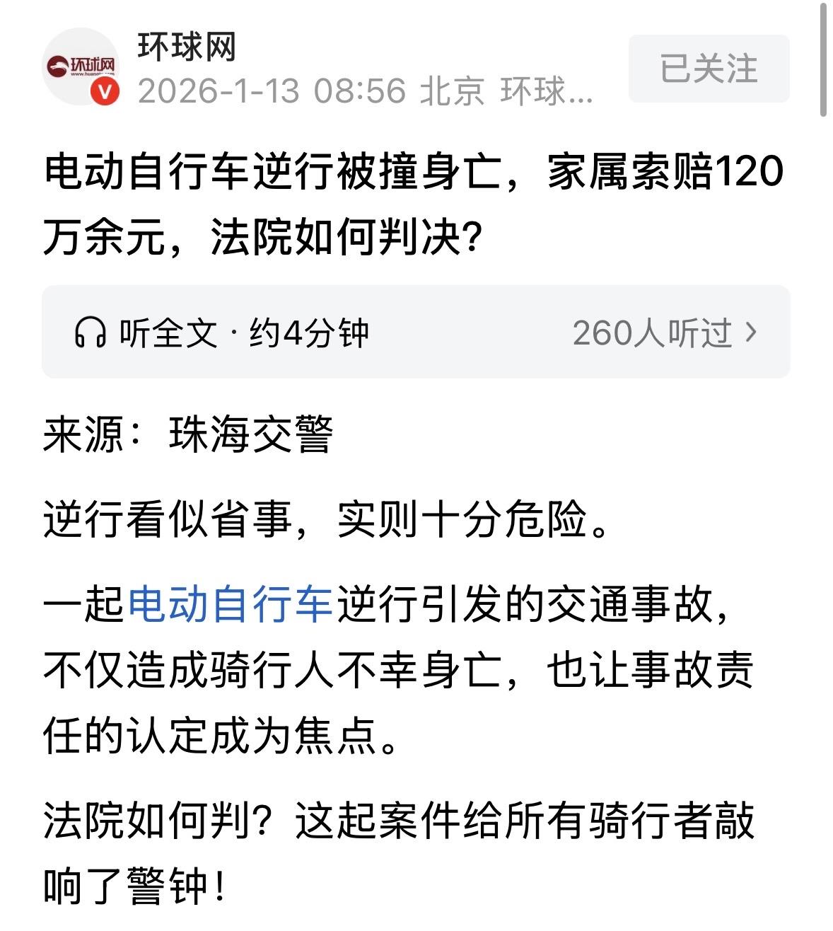“冤不冤?”广东珠海,男子为了抄近道,不管不顾骑着电动车在机动车道逆行,结果,一正常行驶中的车主避让不及,当场与其相撞,男子不幸身亡,事后,家属开口索赔120万,法院判决出乎意料。 这天,王某骑着他的电动自行车出门。 按理说,非机动车该走非机动车道,但王某不知是赶时间还是图省事,直接把车骑进了全是汽车跑的机动车道,而且还是逆着车流方向走。 与此同时,李某开着他的小轿车正常行驶。 车里放着音乐,李某可能也正想着心事,或者注意力全在别的地方,对前方路况的观察没做到位。 等他反应过来前面有辆逆行的电动车时,避让已经来不及了。 两车结结实实地撞在了一起,车辆受损严重,王某当场死亡。 王某的家人悲痛欲绝,直接把李某和李某车投保的保险公司告上了法庭,张口就要死亡赔偿金等各项损失共计120多万元。 在他们看来,人是被你李某的车撞死的,你就得负责到底。 交警到现场一勘察,调了监控,这责任划分其实很清楚,但也很残酷。 交警认为,王某这属于自寻死路的操作。在机动车道里逆行,这是严重的交通违法行为,也是导致这起事故的根本原因。 如果他老老实实走自己的道,或者顺着方向骑,这事儿根本不会发生。所以,王某本人要背事故的主要责任。 李某呢,作为一名机动车驾驶员,交规要求你必须集中精力。 当时路况其实不错,视野也开阔,如果李某稍微留心一点,提前发现那个逆行的身影,踩一脚刹车,也许就能避开这场惨剧。 因为疏于观察,李某最后背了次要责任。 到了法院,双方的争议焦点就在那120万的赔偿款上。 王某家属觉得,我们是肉包铁,你们是铁包肉,人都死了,你们机动车一方难道不该多赔点吗?哪怕不全赔,赔个一大半也是应该的吧? 李某和保险公司也有苦衷。 保险公司方表示,这人是自己逆行撞上来的,我们是正常行驶,属于碰瓷式的自杀行为,按道理我们不该赔这么多,最多在交强险范围内给点人道主义补偿。 李某则表示自己买了全险,该赔多少由保险公司定,但他心里也清楚,自己确实有没看路的错误。 不过有人认为,在一方违反法律法规的情况下,没有违反法律法规的另一方不应承担责任,这样绝大多数人都会建立起不敢随便违法违规的意识,社会秩序会更加有序。只有两方都有违法违规,或者两方都没有违法违规,才能根据实际情况划分各自责任。 机动车道还加上逆行,属于恶意肇事!机动车行驶中来不及反应,而且即便有反应,对向行驶,也难免事故!此案,机动车若无超速问题,无责,赔偿不得超过10%! 那来看看法院怎么判。 法官审理时,引用了《道路交通安全法》第76条第1款第2项:机动车与非机动车驾驶人、行人之间发生交通事故,非机动车驾驶人、行人没有过错的,由机动车一方承担赔偿责任;有证据证明非机动车驾驶人、行人有过错的,根据过错程度适当减轻机动车一方的赔偿责任。 很多人可能不理解,为什么王某自己作死逆行,李某还要赔钱? 这就是第76条的特殊之处:机动车与非机动车之间,适用无过错责任原则。 只要机动车撞了人,法律默认机动车是强,非机动车是弱者。因为机动车速度快、杀伤力大、风险高,法律强制要求机动车一方承担更高的注意义务。 哪怕机动车司机觉得自己没违章,只要撞了人,通常都要先由交强险赔付,超出部分也不能完全免责。 但这也并不意味着谁弱谁有理。 法条后半句规定:有证据证明非机动车驾驶人有过错的,根据过错程度适当减轻机动车一方的赔偿责任。 在本案中,王某的行为不是一般的小错,而是在机动车道内逆行,这属于严重的交通违法行为,也是导致事故的直接原因吧 如果因为保护弱者就让正常行驶的李某全赔,不仅对李某不公,更会纵容非机动车的违法行为,导致更多悲剧。 所以,法院必须在这里划一道线:王某的重大过错,必须成为减轻李某责任的理由。 最后法院判决:对于超出交强险赔偿限额的那部分损失,李某承担40%的赔偿责任。 这部分钱,由保险公司在商业三者险范围内直接赔给王某家属。剩下的60%损失,由王某自己承担。 这个结果意味着,王某家属拿不到120万全款了,但能拿到一部分,大概几十万,这也取决于交强险赔了多少。 法律保护弱者,但不保护找死的人。对于骑电动车的人来说,千万别觉得我弱我有理,也别为了省那几分钟去逆行、走机动车道,一旦出事,命是自己的,责任也是自己的大头。 对于开车的朋友来说,哪怕你买了全险,哪怕对方全责,只要你有一点疏忽,不仅要赔钱,心里还得背上一条人命的阴影,这代价太大了。 不管是开车还是骑车,守规矩才是回家最近的路。 对此,你怎么看? 关注@运良说法 学法律知识不迷路