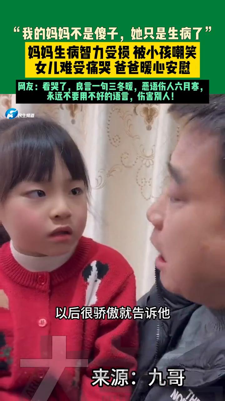 "我的妈妈不是傻子,她只是生病了"。妈妈生病智力受损被小孩嘲笑,女儿难受痛哭,爸爸暖心安慰。 来源:九哥。 网友:看哭了,良言一句三冬暖,恶语伤人六月寒,永远不要用不好的语言伤害别人! 你哭脸怎么了?有人嘲笑妈妈,说妈妈怎么了?说妈妈是傻子是吧?我们一定要心态要强大,好不好?不哭脸,以后很骄傲就告诉他,我的妈妈没有生病之前就是这么漂亮,这是我最喜欢的妈妈。是的,早点睡,等我。