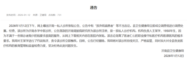 “低端患者,花1块钱,要10块钱的药,100块的效果,还得要1000块的服务!转头挑三拣四,耍赖讹钱,你不满足他,就拿医德绑架你。”近日,有患者反映山东沂南县中医肾脏病研究所张贴告示称,“要放弃低端患者”。消息一出,引发质疑。