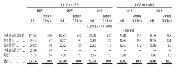 从收入构成看,红星冷链主要依靠冷冻食品仓储服务、门店租赁及装卸服务三项业务。2025年上半年,冷冻食品仓储服务收入约8119万元人民币,占比约68.8%;门店租赁服务收入约2377万元,占比约20.1%;装卸服务收入约1125万元,占比约9.5%。