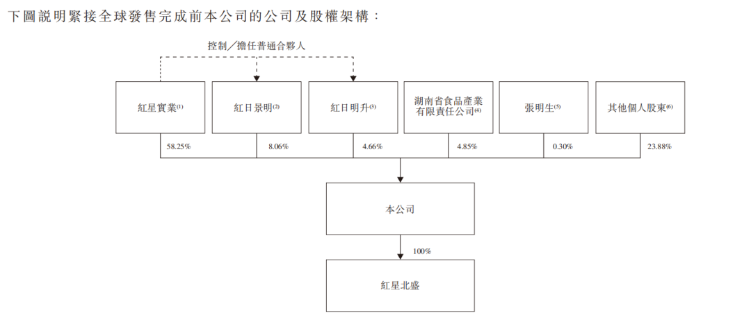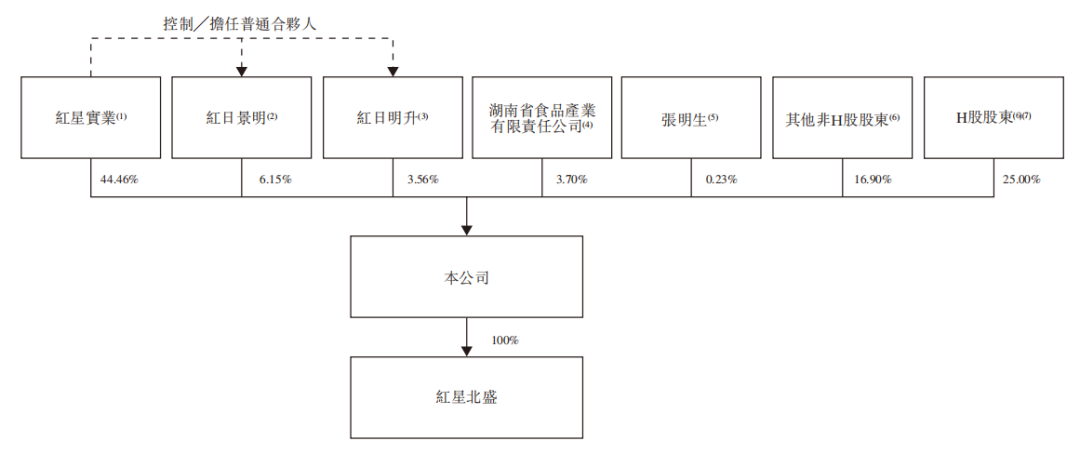 综合计算,红星实业、红日景明、红日明升及红星中心合计控制公司已发行股本约70.97%。此外,湖南省食品产业有限责任公司在上市前持股约4.85%,执行董事张明生个人持股约0.3%。