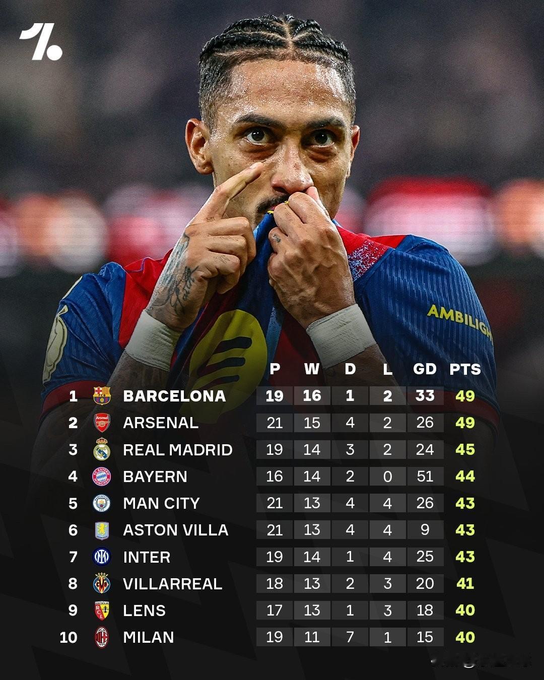 巴萨依然位居欧洲五大联赛顶尖球队之列,尽管他们比英超俱乐部少赛2场🔝😮💨 🇫🇷 而朗斯继续为法国旗帜飘扬🔥 🇩🇪 拜仁慕尼黑保持不败,16场比赛后仅落后榜首5分😵 🏴🇪🇸 前十名中有六支球队来自英格兰或西班牙联赛💥