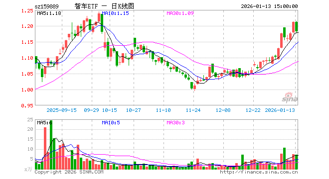 1月13日,智能汽车ETF(159889)跌2.39%,成交额863.37万元。当日份额减少100.00万份,最新份额为4040.08万份,近20个交易日份额增加100.00万份。最新资产净值计算值为4781.03万元。
