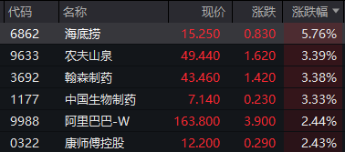 上证报中国证券网讯1月14日,恒生指数高开0.46%,恒生科技指数涨0.42%。成分股中,海底捞涨逾5%,农夫山泉、翰森制药、中国生物制药涨逾3%,阿里巴巴涨逾2%。