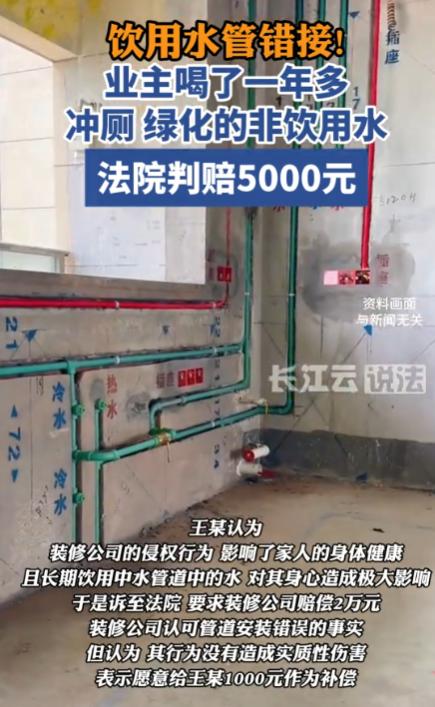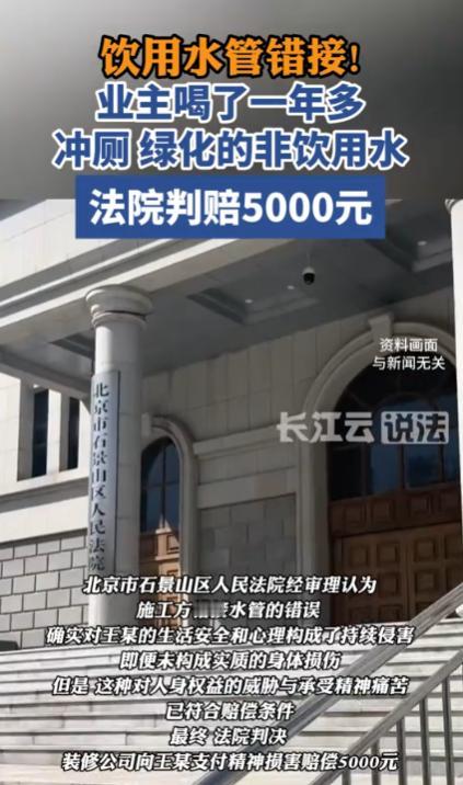 “天塌了!”近日,北京,一男子新房装修入住一年后,才发现自家的饮用水管接的是中水管道,男子一想到家人喝了一年的中水管道水顿觉恶心,于是怒将装修公司告上法庭,法院最终判装修公司赔偿5000元。网友:喝了一年中水,只赔5000?   5000块钱,能抹平一年喝中水的心理阴影吗?北京业主王先生的一纸诉状,将家装行业隐蔽工程的乱象再次拉回公众视野。   时间倒回一年多前,王先生揣着对新家的期待,敲定了一家口碑尚可的装修公司。   在所有装修环节里,他最看重水电改造,几乎每天都泡在施工现场盯进度,管道走向、接口处理都一一确认,验收时也没看出任何破绽。   入住后的日子平淡且规律,水龙头里流出的水清澈透明,烧水没有水垢,煲汤也没有异味,全家人的饮食起居,都依赖着这看似正常的“自来水”。   可谁也不会想到,这看似安全的水流背后,藏着一个致命的疏漏,转折发生在一次水管漏水报修后,维修师傅的扳手刚拧开管道接口,脸色就沉了下来。 他指着一根浅绿色的管道告诉王先生,这是小区的中水管道,按北京的规定,只能用来冲厕、绿化,绝对不能接入饮用水系统。   浅绿色这个本该是安全警示的颜色,却被装修工人的粗心忽略,硬生生将两条泾渭分明的管道错接在一起。   得知真相的那一刻,王先生只觉得胃里一阵翻江倒海。   他脑海里瞬间闪过无数画面:清晨餐桌上的热粥、周末给孩子炖的排骨汤、全家人饭后喝的温开水,这些日常的烟火气,刹那间变成了难以言说的恶心。   当晚,他辗转难眠,越想越后怕,天一亮就带着全家去医院做了全面体检。   万幸的是,各项指标都显示正常,但医生的一句“长期饮用中水存在潜在健康风险,需定期复查”,还是让他的心悬在了半空。   愤怒的王先生找到装修公司讨说法,对方的态度却让他寒了心。   起初,装修公司以“水电工是外包团队,公司不知情”为由百般推诿,直到王先生拿出维修师傅的检测报告和管道照片,才不得不承认施工失误。   即便如此,他们也只愿意承担维修费用,对精神损失和健康隐患绝口不提。   协商不成,王先生选择诉诸法律,北京市石景山区人民法院的庭审现场,有一个细节被反复提及。 涉事物业的中水处理系统早已停用多年,中水管道内实际是流经回用池的自来水,并非真正意义上的 “中水”。   这一事实成了案件的关键,装修公司据此辩称,虽然接错管道有错在先,但并未造成实质性的健康损害,最多只能补偿1000元。   但法院的判决给出了明确答案。根据《民法典》相关规定,侵害自然人人身权益造成严重精神损害的,被侵权人有权请求精神损害赔偿。   法院审理认为,装修公司作为专业施工方,负有保障施工质量的法定义务,其疏忽大意导致的管道错接,不仅违反了合同约定,更让业主全家在不知情的情况下饮用非饮用水长达一年。   即便没有造成伤残后果,但由此带来的心理恐慌和精神压力,已经构成了实质性的损害。   最终,法院判决装修公司承担王先生全家的体检费用,赔偿5000元,并负责将水管整改到位。   判决结果一出,立刻在网络上炸开了锅,有人直言“赔偿太少”,认为一年的心理折磨和潜在健康风险,远非5000元能弥补。   有人共情王先生的遭遇,“一想到自家水管可能也有问题,现在喝水都有心理阴影”。   也有理性声音指出,在没有明确健康损伤的前提下,5000元的判决已经是法院综合多方因素后的裁量结果。   这场争议的背后,是大众对“中水”的认知盲区,更是对家装行业施工规范的拷问。   所谓中水,就是经过处理的再生水,其净化标准远低于自来水,国家明确规定只能用于非饮用领域。   为了避免错接,北京更是强制要求中水管道使用浅绿色标识,可这样的硬性规定,在部分装修工人的操作中,却成了一纸空文。   回到王先生的案件,5000元的赔偿金额,成了这场纠纷最具争议的注脚。   它折射出的,是司法实践中精神损害赔偿标准的模糊地带。   在没有明确伤残鉴定的情况下,如何界定精神损害的严重程度?如何平衡侵权方的过错成本与受害方的心理损失?   这些问题,不仅需要更细化的法律条文指引,更需要结合具体案件的实际情况综合考量。   如今,王先生家的水管已经整改完毕,但每次打开水龙头,他还是会下意识地多看几眼,那股难以言说的恶心感,或许会伴随他很久。   这场由一根错接的水管引发的风波,不仅是一个家庭的维权故事,更是给整个家装行业敲响的警钟。   装修承载的是人们对美好生活的期许,而这份期许的底线,是安全,无论是装修公司还是监管部门,都该守住这份底线,不让粗心与漠视,毁掉一个家庭的安居梦。     信息来源:人民日报发布:饮用水管错接中水管一年多,装修公司被判赔偿