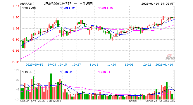 1月14日,沪深300成长ETF(562310)开盘涨0.00%,报1.043元。沪深300成长ETF(562310)重仓股方面,宁德时代开盘涨0.29%,贵州茅台涨0.00%,紫金矿业涨0.97%,新易盛涨1.25%,中际旭创涨1.64%,立讯精密跌0.70%,恒瑞医药涨0.05%,比亚迪跌0.39%,药明康德跌0.05%,五粮液跌0.11%。