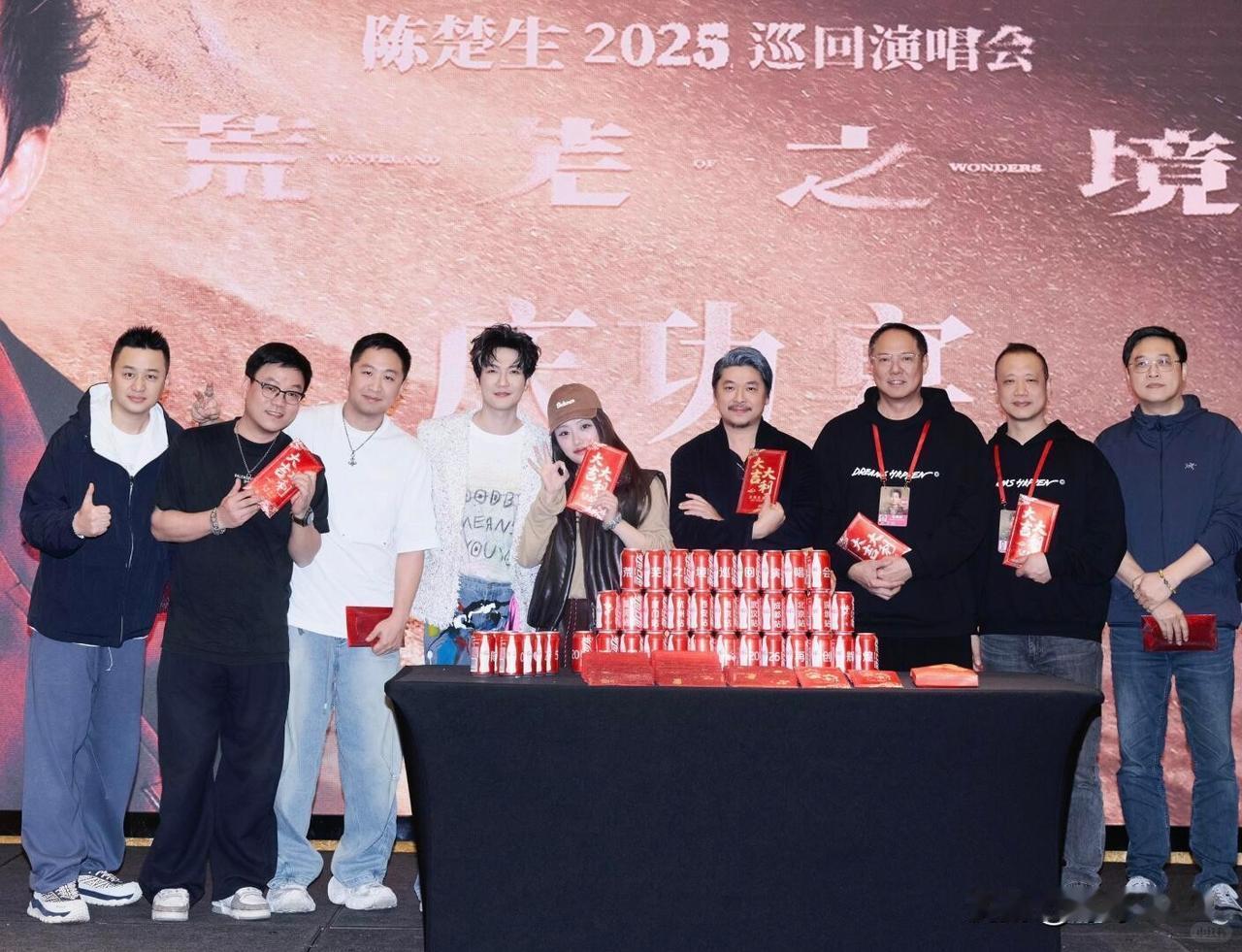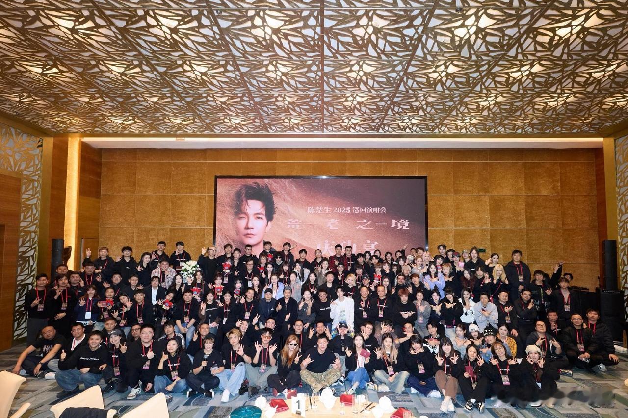陈楚生的庆功宴办的蛮盛大的, 云姐手气好抽到特等奖, 粉丝说特等奖是“夜夜生哥”嘿嘿! 这轮巡演, 舞团,乐队,舞台配置都是很顶的, 大合照就能看出来人数众多啊, 所有工作人员都有礼物, 额外还有现金红包等等抽奖, 每个人都发号码卡片, 用惊喜延续快乐, 云姐站了2天,在台下忙前忙后, 这个特等奖是什么,就让她保密吧, 以背影和舞台上的他合影留念, 两口子其实都很有仪式感, 生哥说过:我老婆比我浪漫![心]