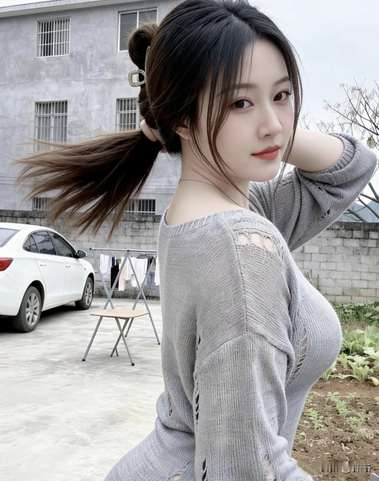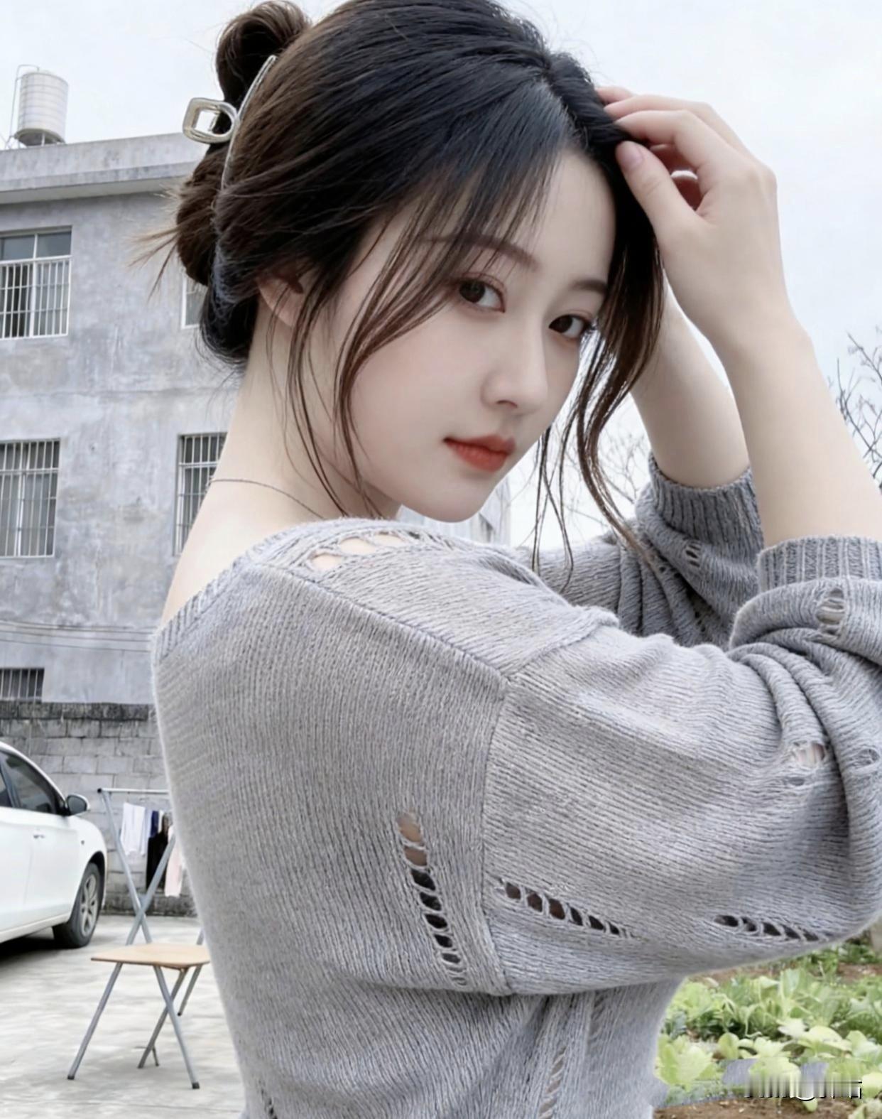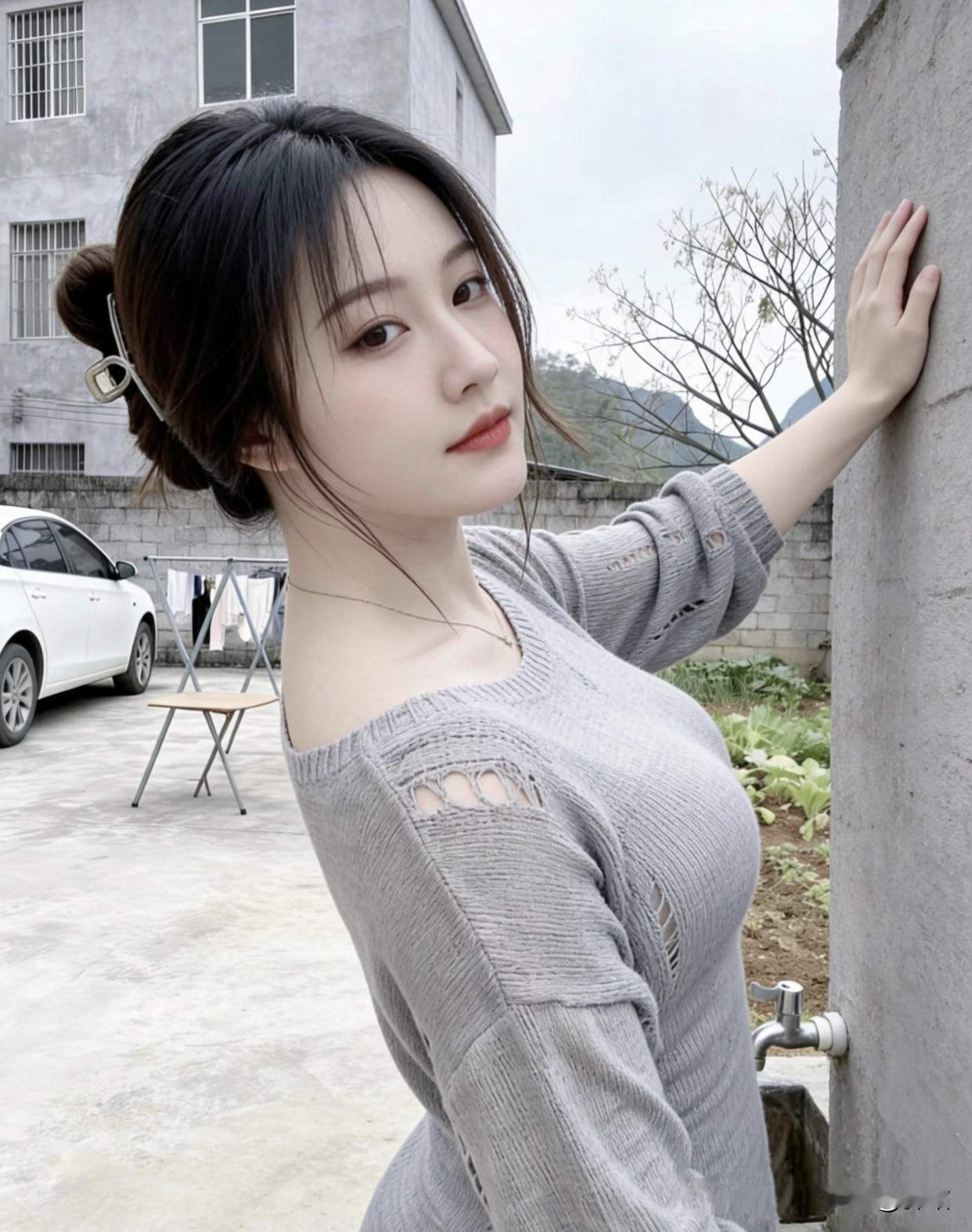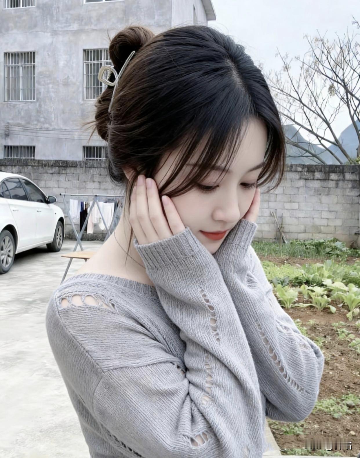 美图欣赏,看图写诗 《晴院甜隅》 七言绝句 晴庭晓色惹眉弯, 绾髻轻扬笑靥欢。 灰袂翩然裁软景, 一颦皆是小清欢。 现代诗 春日点缀了院子, 灰针织的柔软裹着暖。 发簪别住的丸子头, 晃一晃, 就抖落了细碎的光。 手贴在墙上的瞬间, 风也停下脚步, 菜地的绿、远山的青, 都成了你身后温柔的景。 你站在这烟火里, 甜得像刚剥开的水果糖。 图片来源于网络