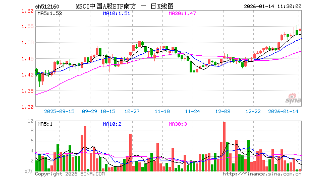 1月14日,截止午间收盘,MSCI中国A股ETF南方(512160)涨1.31%,报1.541元,成交额61.01万元。MSCI中国A股ETF南方(512160)重仓股方面,贵州茅台截止午盘涨0.43%,宁德时代跌0.22%,工业富联涨1.55%,招商银行跌0.15%,长江电力涨0.26%,紫金矿业涨2.07%,中国平安涨0.12%,比亚迪涨0.22%,海光信息涨5.96%,寒武纪涨1.56%。