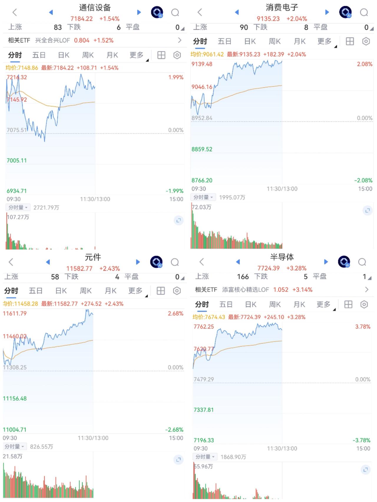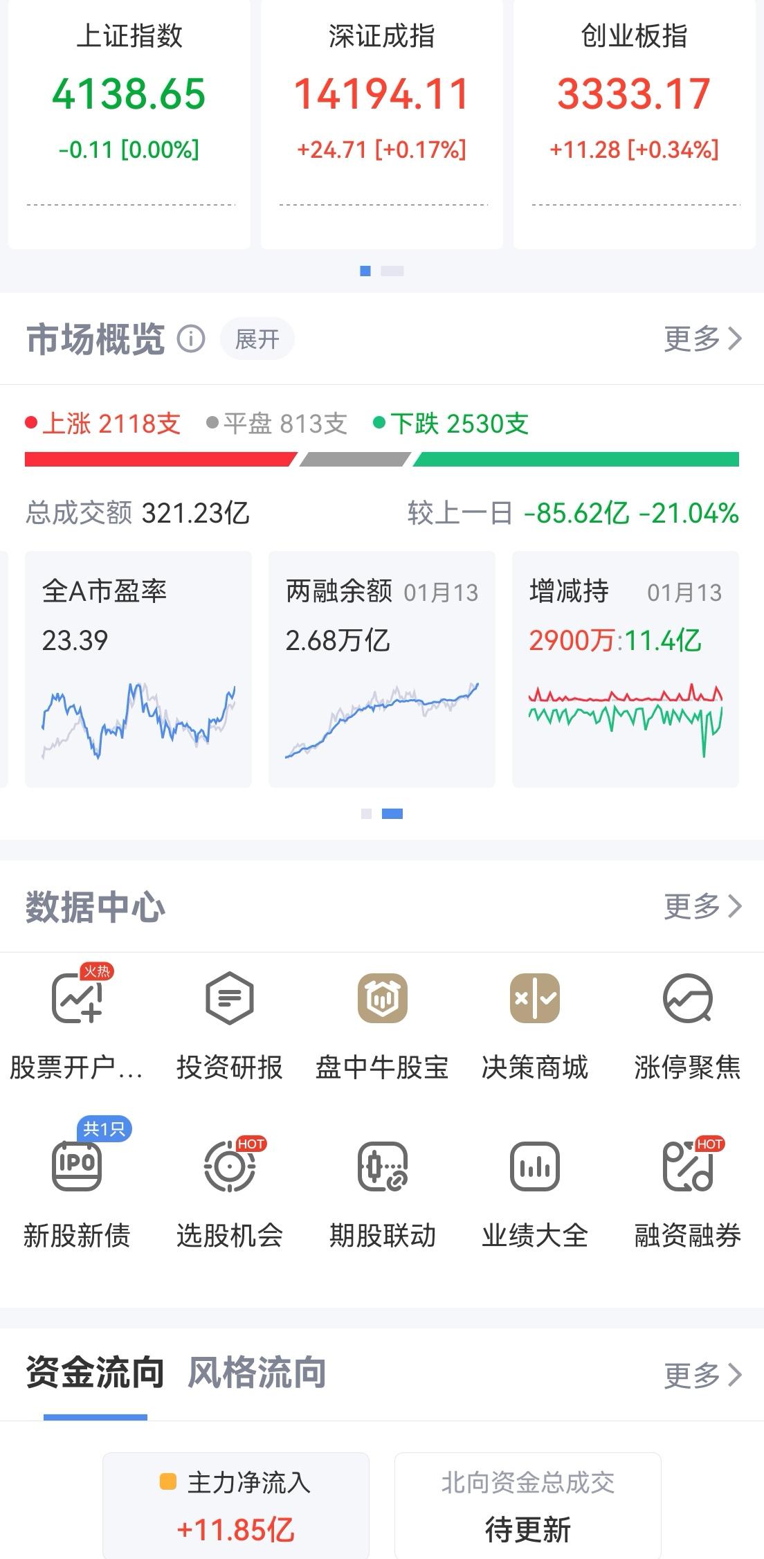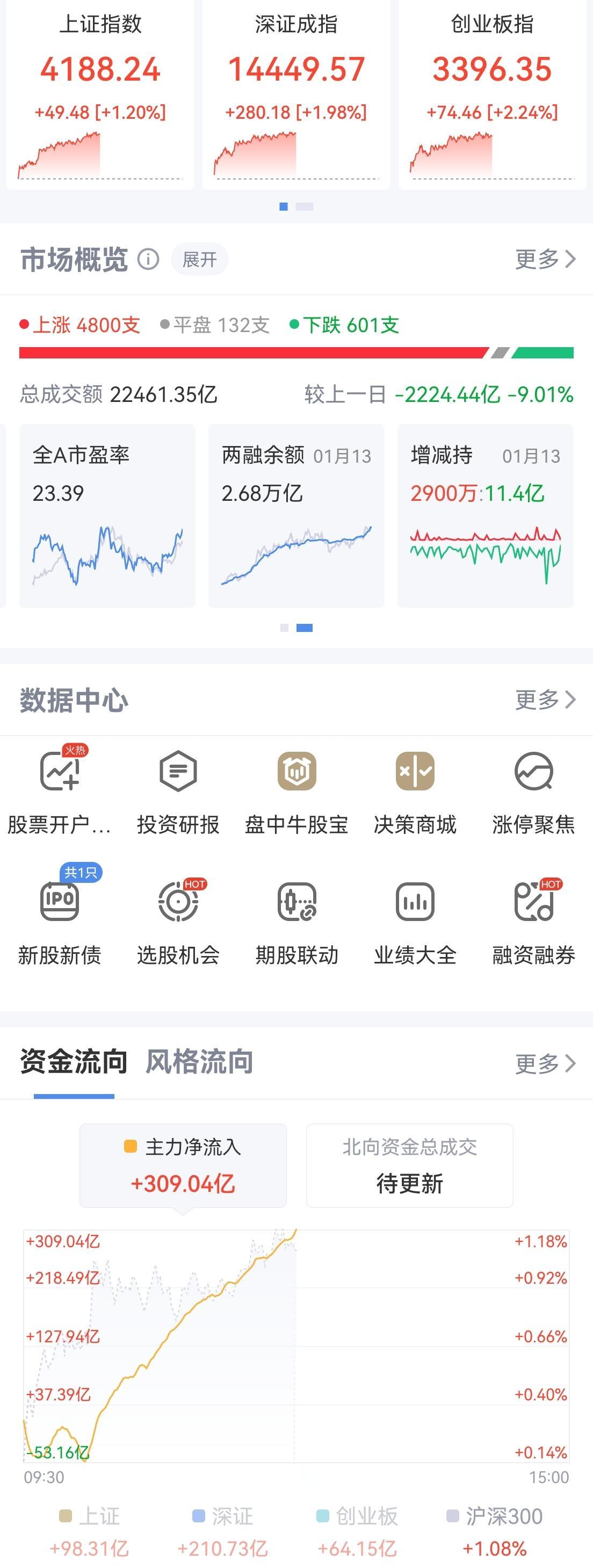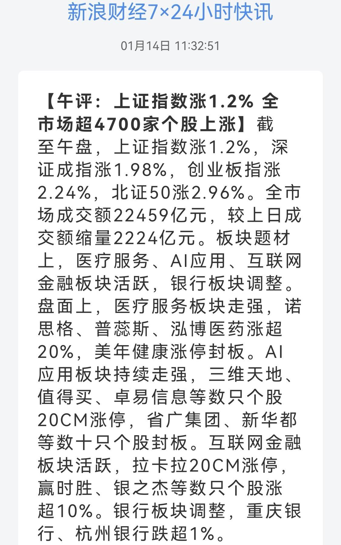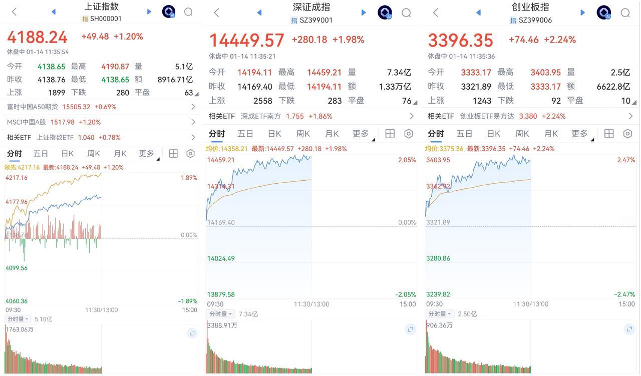 午盘印象(1月14日) 震荡攀升 软硬切换 外围:美股跳水微绿 英伟达跳水 隐忧不减 内股:商业航天回归 引领科技 一、三大股指开盘红绿 指数微微强 个股开盘涨平跌比率39%:15%:46%。 个股开盘弱势(-8 Vs +12个百分点),远逊上个交易日,强弱逆转, 二、指数震荡上扬,快速收复失地: 科技回调,红利回暖护盘 2.4万亿半日交易,指数冲高回落 三、涨跌幅榜: 航天引领科技AI应用,红利低迷,旗手反弹 跌幅前列:银行、能源金属 涨幅前列:AI应用、金属类、大金融 四、开盘和午盘: 开盘:沪-0.00%、深+0.17%、创+0.34%。 午盘:沪+1.20%、深+1.98%、创+2.24%。 震荡上涨 五、午盘个股上涨87%,接近九成,与昨日涨跌差距(+76 Vs -8个百分点),巨幅改善 相比开盘,涨跌差正面,上涨增长迅速; 净流入 +309(-934)亿,环比昨日资金回流 六、沪深两市成交量午盘22,197亿,上个交易日24,352亿,同比量能萎缩近2,200亿,缩量中阳。 七、指数新高仍不间断,攀升势头又回归 半日成交2.2万亿,买入仍汹涌 融资额连续7天增长,两融余额已至2.68万亿,新开仓谨慎 午后两种情形: 1、平行震荡:时间换空间,震荡消化获利盘,红包行情继续。 2、震荡回落:量能高位,谨防跳水,慢牛格局不变。 (图片源自网络侵权告知删除)