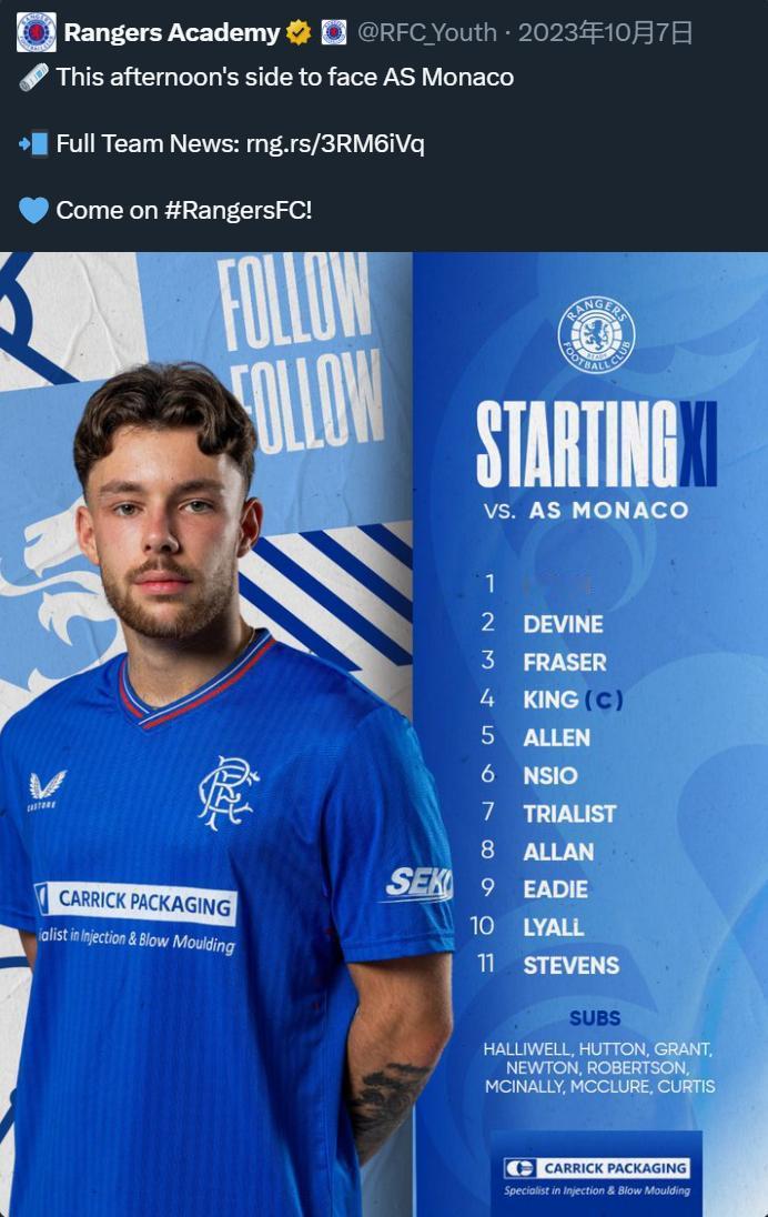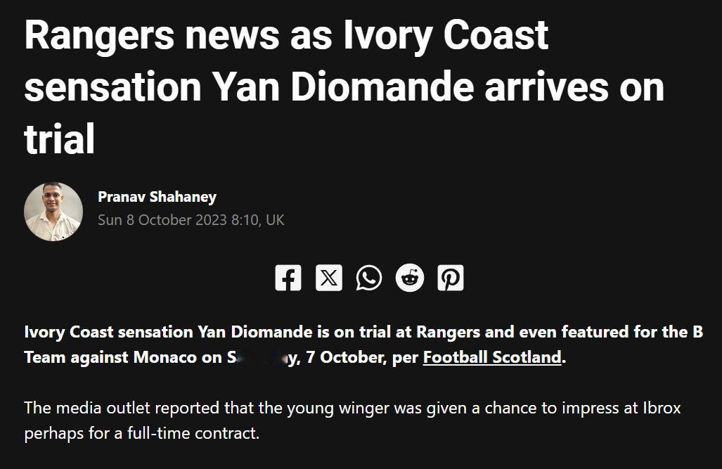 2023年名为“试训者”的扬·迪奥曼德 2023年10月7日,格拉斯哥流浪者预备队与摩纳哥进行了一场热身赛,首发阵容里的7号“试训者”,就是本赛季在德甲RB莱比锡大放异彩的科特迪瓦边锋扬·迪奥曼德。 不过赛后流浪者俱乐部并未与他签约,扬·迪奥曼德回到了DME体育学院。