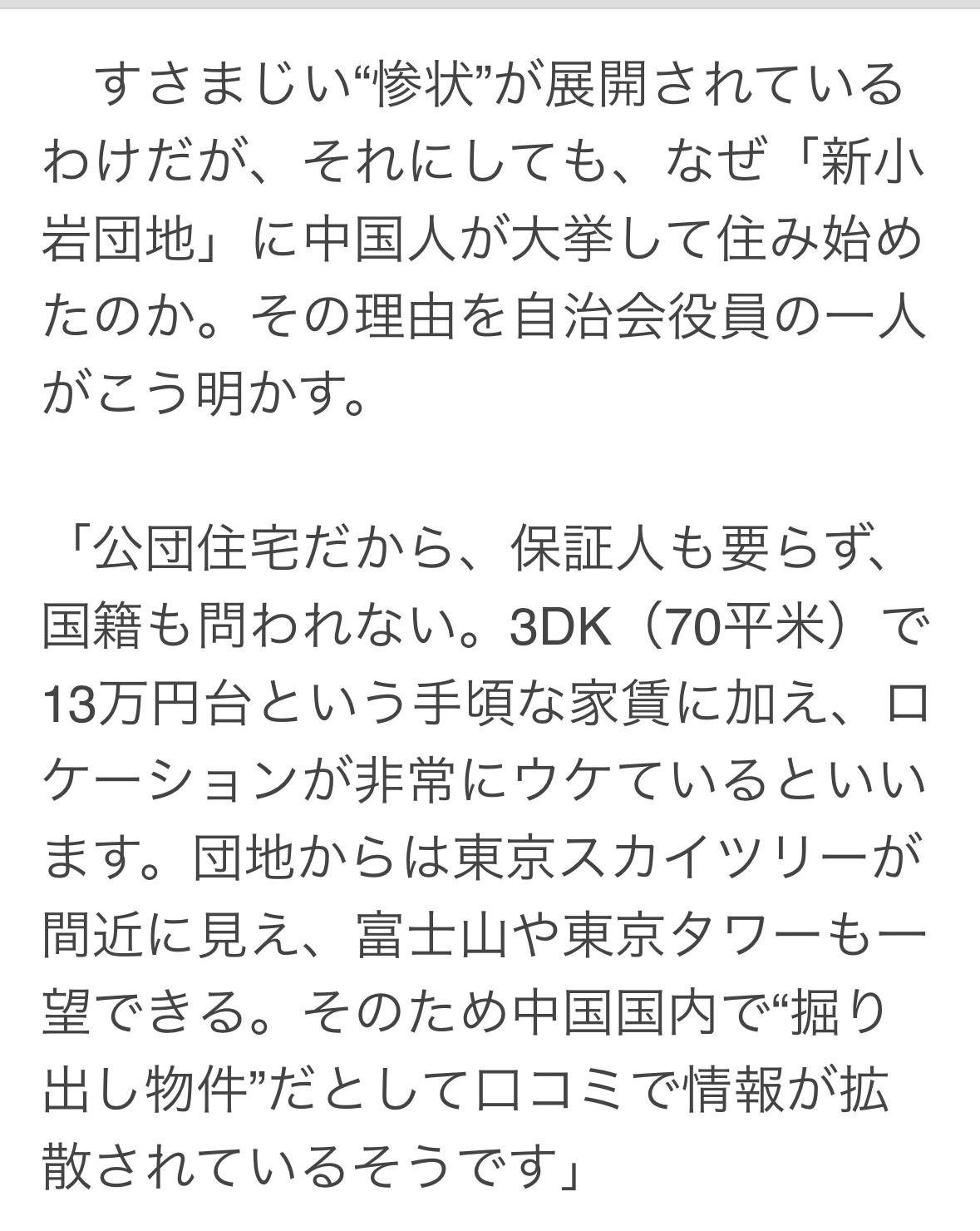 楼梯上人类粪便,从阳台上扔垃圾。东京新小岩的居民对中国居民的迅速增长感到困惑! -位在这里做了五年保洁的人讲:感觉来这里之后,外国居民数量增加了近30%。很多外国人不懂垃圾分类规则,不遵守收集日、垃圾不分类的情况一点也没有减少。最让人恼火的是从阳台上扔垃圾的中国人,绕楼道走一圈就能发现四五十个烟头。 最大的问题是处理人类粪便,每年都会在公共区域的楼梯上发现两三次,虽然每次都用水冲洗,但臭味就是散不掉。 为何这么多中国人选择入住新小岩?社区负责人解释道:因为这是公屋,无需担保人,国籍也不限。除了租金合理,一套70平方米的三居室公寓月租仅约13万日元外,地理位置优越。从小区内可以近距离欣赏东京晴空塔,还能远眺富士山和东京塔。