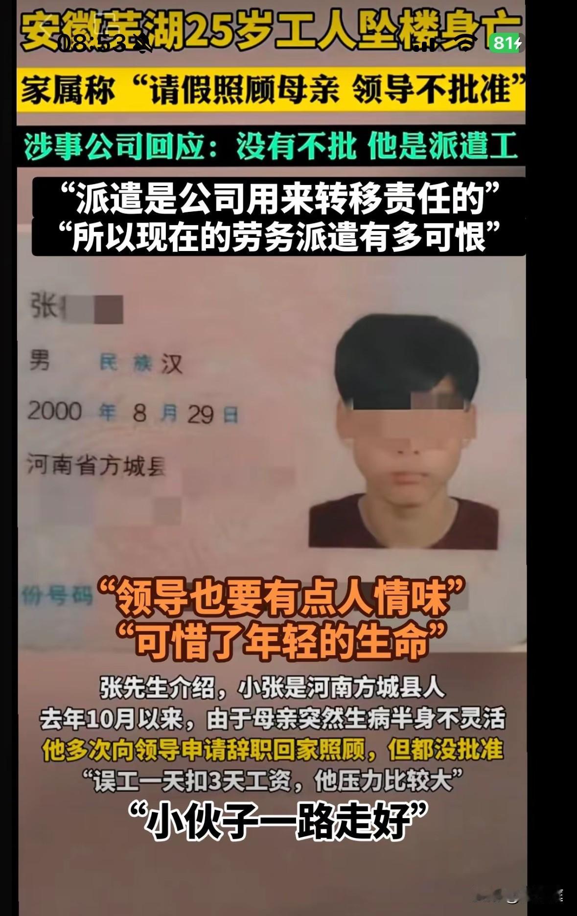 25岁小伙从34岁楼跳下后,最惨的莫过于他的姐姐了。她们的母亲半身不遂,本就需要专人伺候,如今弟弟也没了。这就意味着,未来所有的压力都承担在了她一人身上! 她们是河南省方城人,弟弟小张于2000年出生。前不久,得知母亲生病后,小张便想要从芜湖的公司离职回到老家去照顾母亲。 悲剧是2025年12月27日晚上发生的,当天,年仅25岁的小张从34楼一跃而下,结束了自己年轻的生命! 悲剧发生后,有多名工友实名证实:小张生前曾向领导辞职,但领导并未批准。辞职被拒后,小张承担了巨大的心理压力。 他是通过劳务派遣公司进入该家公司的,在辞职未得到批准之前,矿工一天得扣三天工资! 这样的经历,只有经历过的人才会懂!工人们一天需要付出数个小时的时间与汗水,才能换来为数不多的薪水。而一天不上班就扣三天工资,这对于任何一个在厂里上班的年轻人来说,都不是一件好接受的事情。 而这个小伙子一边急需去看护和照顾母亲,一边还得面对无法排解的压力,最终选择了轻生。 眼下,最难的要属他的姐夫、姐姐。本来,他们还有个弟弟可以分担一下母亲的养老责任。可随着小张的离去,所有的压力都给到了他们。 可怜的小张终究是冲动了,他忽略了,无论任何事都远远没有自己的生命更重要!他的母亲本身就病着啊,如今,这样的结果让老人如何接受呢?[祈祷][祈祷][祈祷]