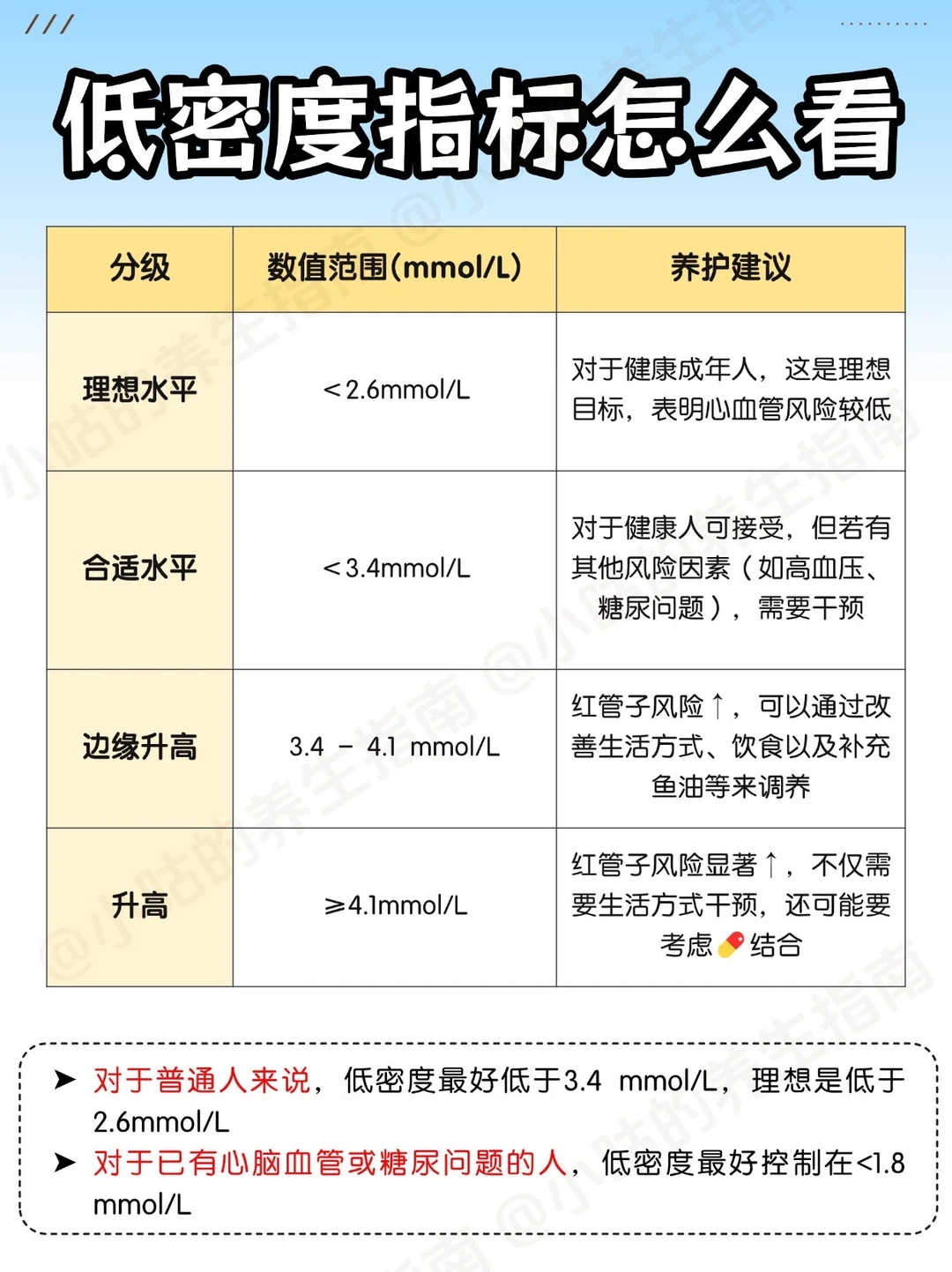📖国际上公认,健康成年人LDL应控制在3.4 mmol/L以下,心血管高风险人群最好低于1.8 mmol/L