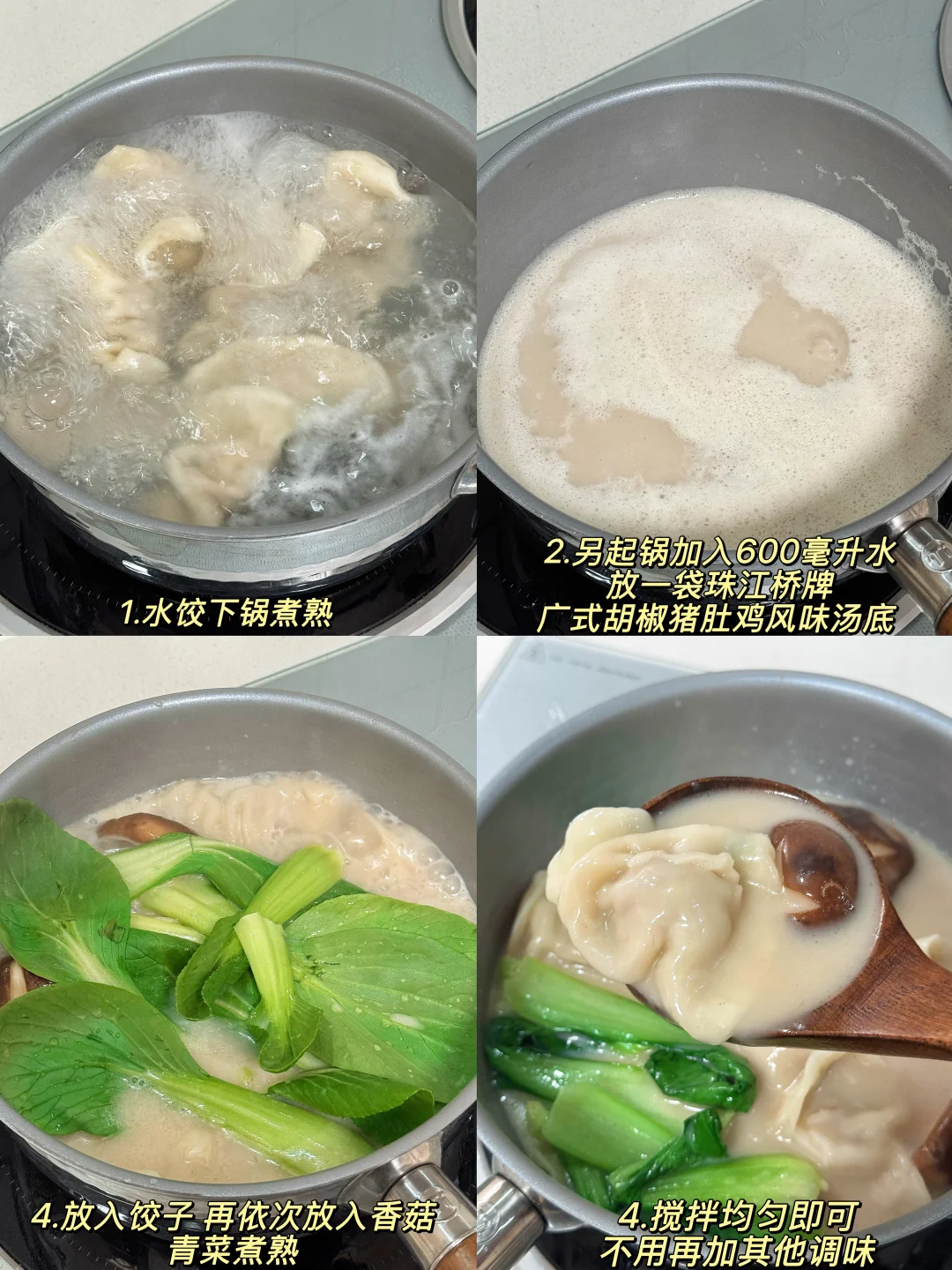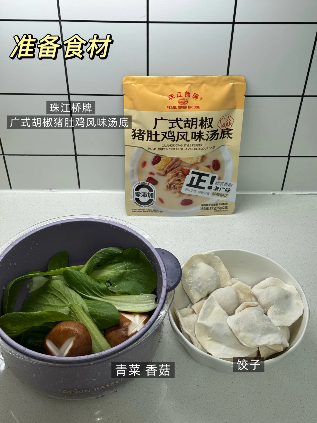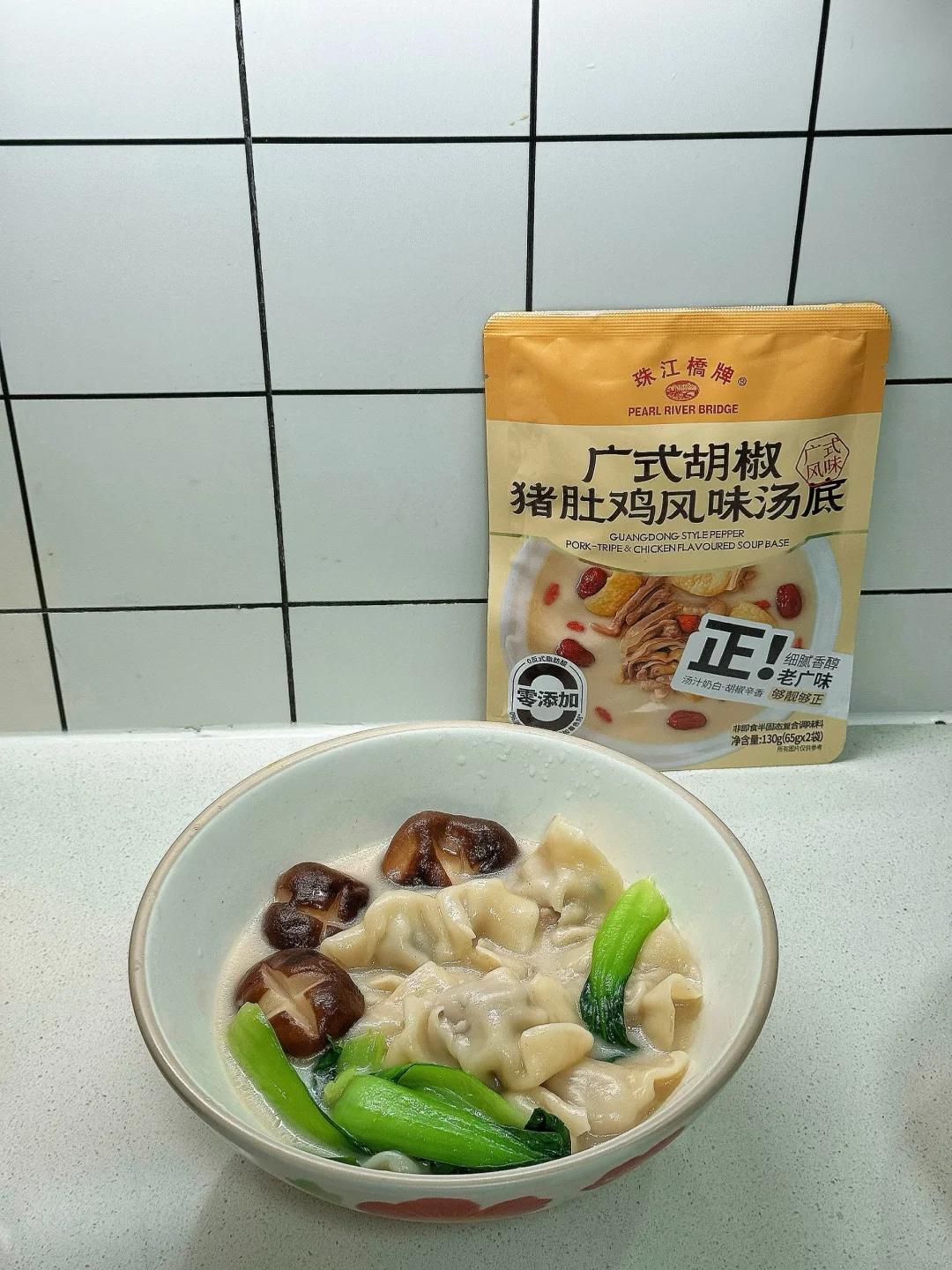 今天的水饺配上珠江桥牌广式胡椒猪肚鸡风味汤底,那叫一个鲜!好吃到汤都能喝完,快来试试做法吧! 📜食材:水饺、青菜、香菇、一袋珠江桥牌广式胡椒猪肚鸡风味汤底。 🍳做法: 1.水开后把饺子煮熟 2.另起锅加入600毫升水,放一袋猪肚鸡汤底 3.煮开后放入水饺,再依次放入香菇和青菜煮熟即可。 这个猪肚鸡汤底配水饺真的太好吃啦,不仅可以煮水饺,还可以用来煮面条、炖菜、煮火锅等,好吃又方便,快来试试吧~