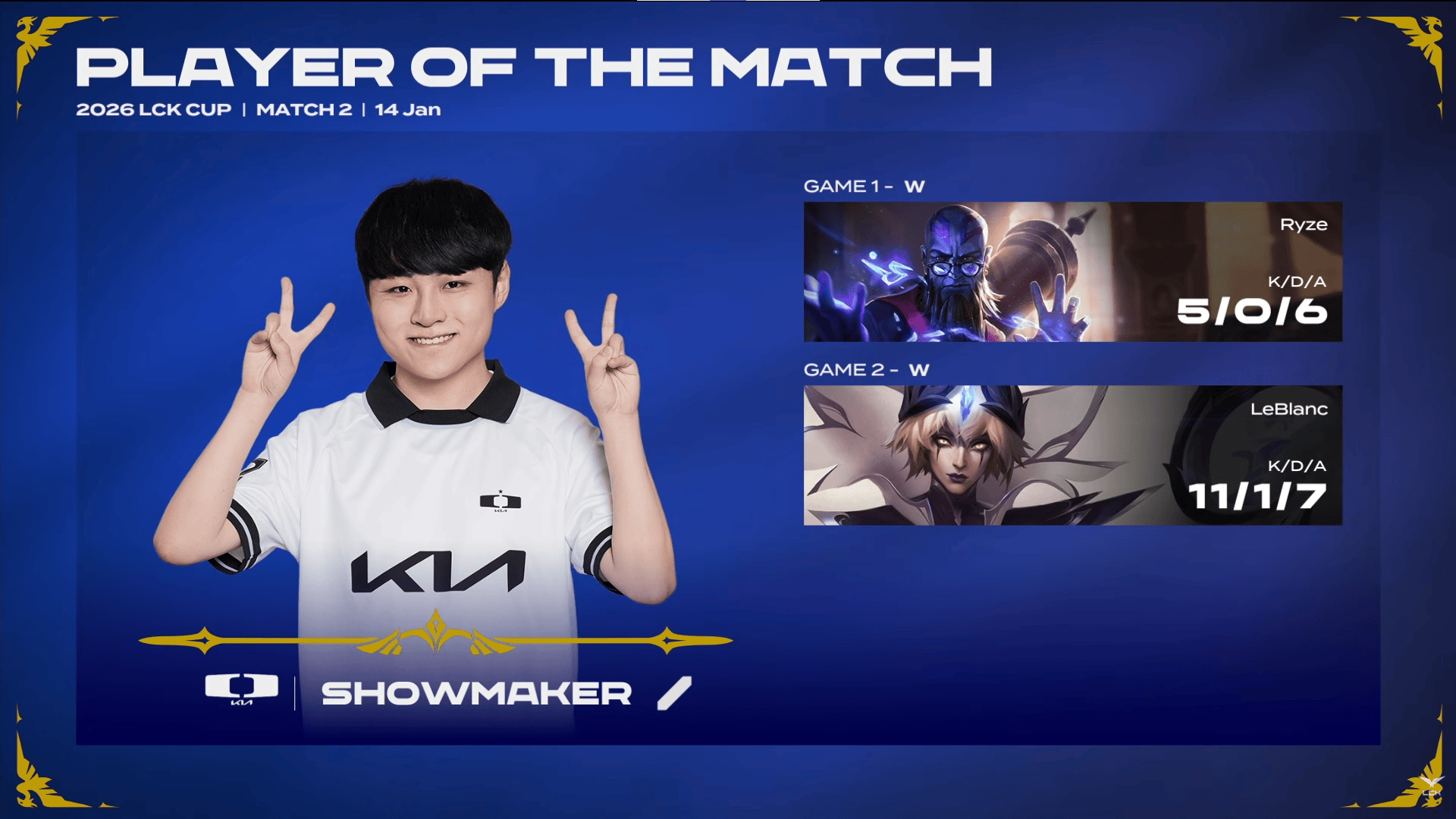 虎扑01月14日讯在刚刚结束的LCK杯的比赛中,ShowMaker两局合砍16/1/13的战绩,拿下DK对阵BRO系列赛MVP