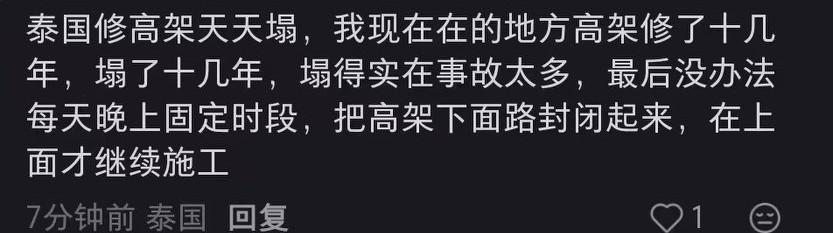 对于泰国东北部客运列车被砸一事,泰本地IP的网友这样说: “泰国修高架天天塌,我现在在的地方高架修了十几年,塌了十几年。塌的事故实在太多,最后没办法每天晚上固定时段,把高架下面的路封闭起来,上面才继续施工”。 有人问是不是上面贪污严重,材料有问题。 网友回答: “工艺、材料都有比较严重的问题”。 据称出事的高架桥由泰国公司施工,此公司的创始人是意大利裔泰国人。