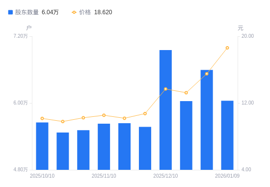 日期A股户数(户)流通A股户均持股数(股)户均持股市值(万元)2026-01-096041911774.4321.922025-12-316594510787.7716.732025-12-196035311787.1215.612025-12-106952910231.5314.012025-11-285571012769.4913.712025-11-205637612618.6312.852025-11-105629912635.8913.322025-10-315513312903.1313.212025-10-205471013002.8912.732025-10-105650812589.1612.79