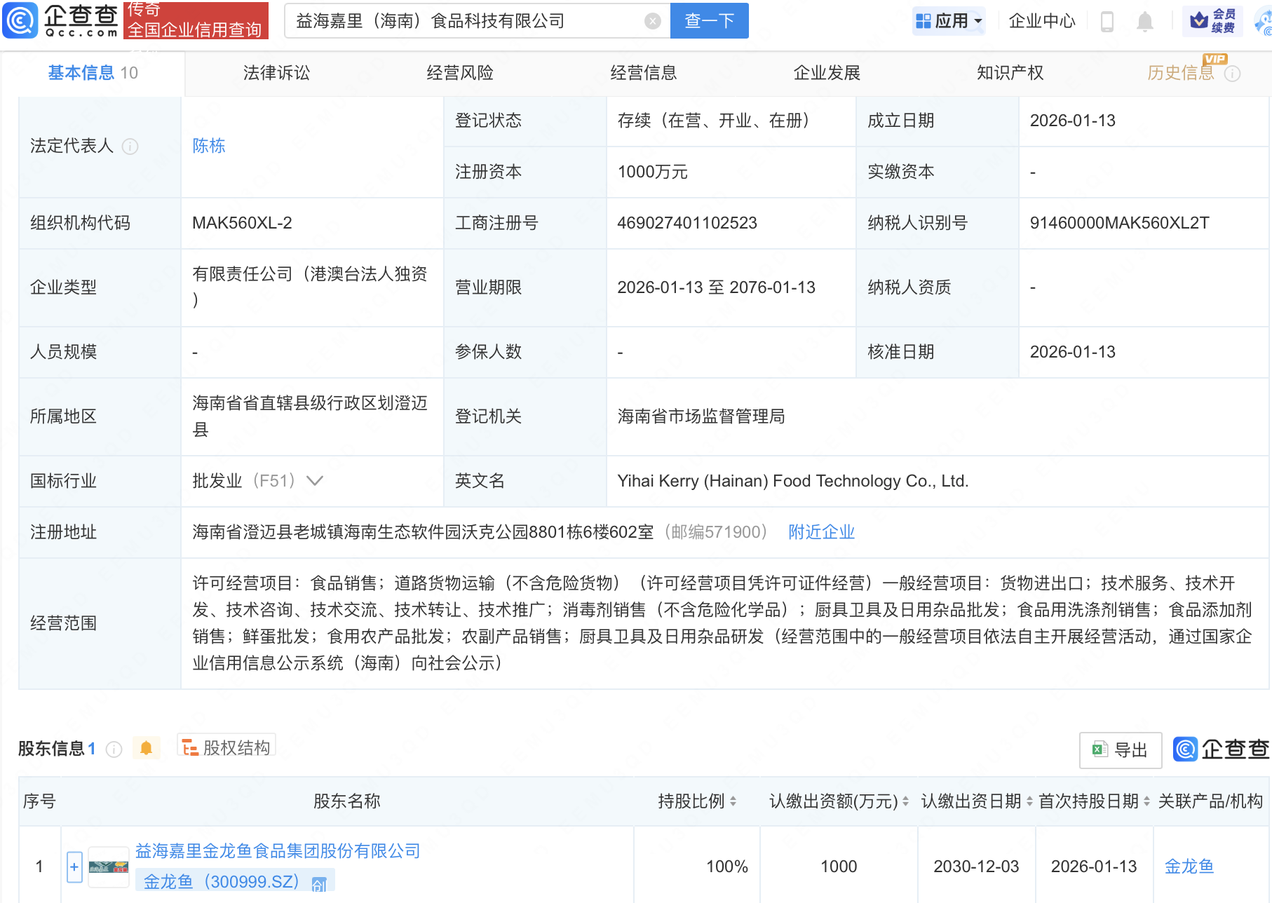 企查查APP显示,近日,益海嘉里(海南)食品科技有限公司成立,注册资本1000万元,经营范围包含:食品用洗涤剂销售;食品添加剂销售;鲜蛋批发;食用农产品批发等。企查查股权穿透显示,该公司由金龙鱼(300999)全资持股。