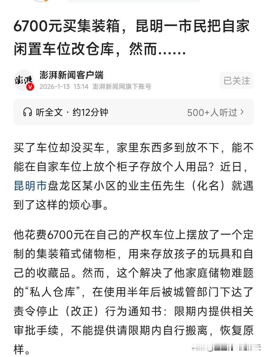 昆明一市民把自家停车位放置了一个移动仓库被城管贴限期整改通知! 伍先生买的小区一小居式房子,结婚生子后,物品越来越多,都爆塞不下了,看到自己当初买房子一起购买的产权停车位闲置了六七年之久,自己也没买车,闲置可惜了,也看到别的小区也有人把自家车位改造一个集装箱的仓库当储藏室用。他在网上找了商家,花了6700元定制了一个集装箱式的仓库,下面带有四个移动轮子,把家里的小孩用的玩具、书籍等物品放到仓库里整整齐齐,然而。半年后,不知道被谁举报了,被城管上门要求限期整改并恢复原状。 对此,伍先生非常苦恼,为什么别人家可以,他家不行?再说车位是自己宾,有产权的,为什么不可以利用起来而一起闲置着都不让用呢?咨询当地多个部门回复目前暂时无这方面的律法界定与适用法规,另外,车位只中停车用的,擅自改变规划用途是不允许的。 对于此事大家怎么看?假如你家的车位闲置可以这样改造后充分利用起来吗?