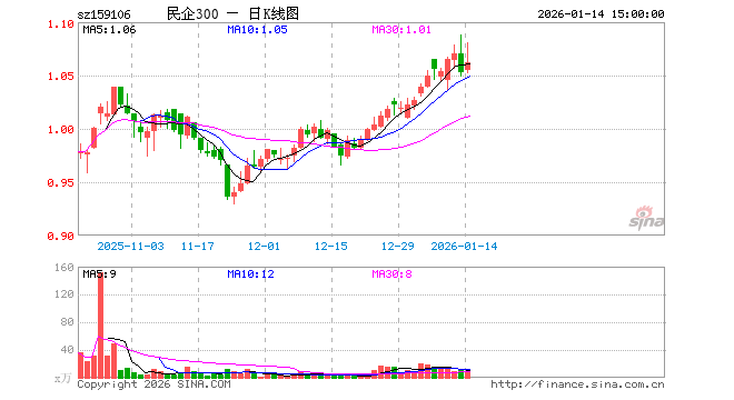1月14日,民企300ETF前海开源(159106)涨0.85%,成交额767.83万元。当日份额减少200.00万份,最新份额为1.02亿份,近20个交易日份额减少1.10亿份。最新资产净值计算值为1.08亿元。